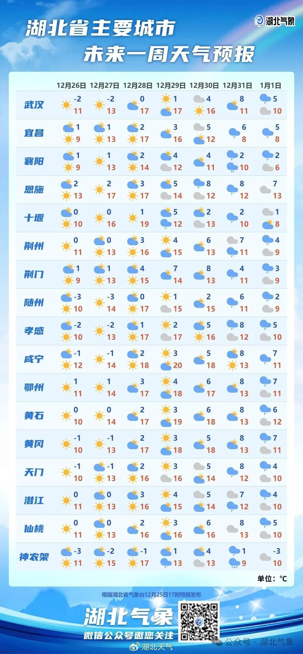 12月26日08时-27日08时,全省晴天间多云。最高气温9~13℃,最低气温北部-5~-1℃、南部-1~2℃,偏东风2到3级、阵风4到5级。