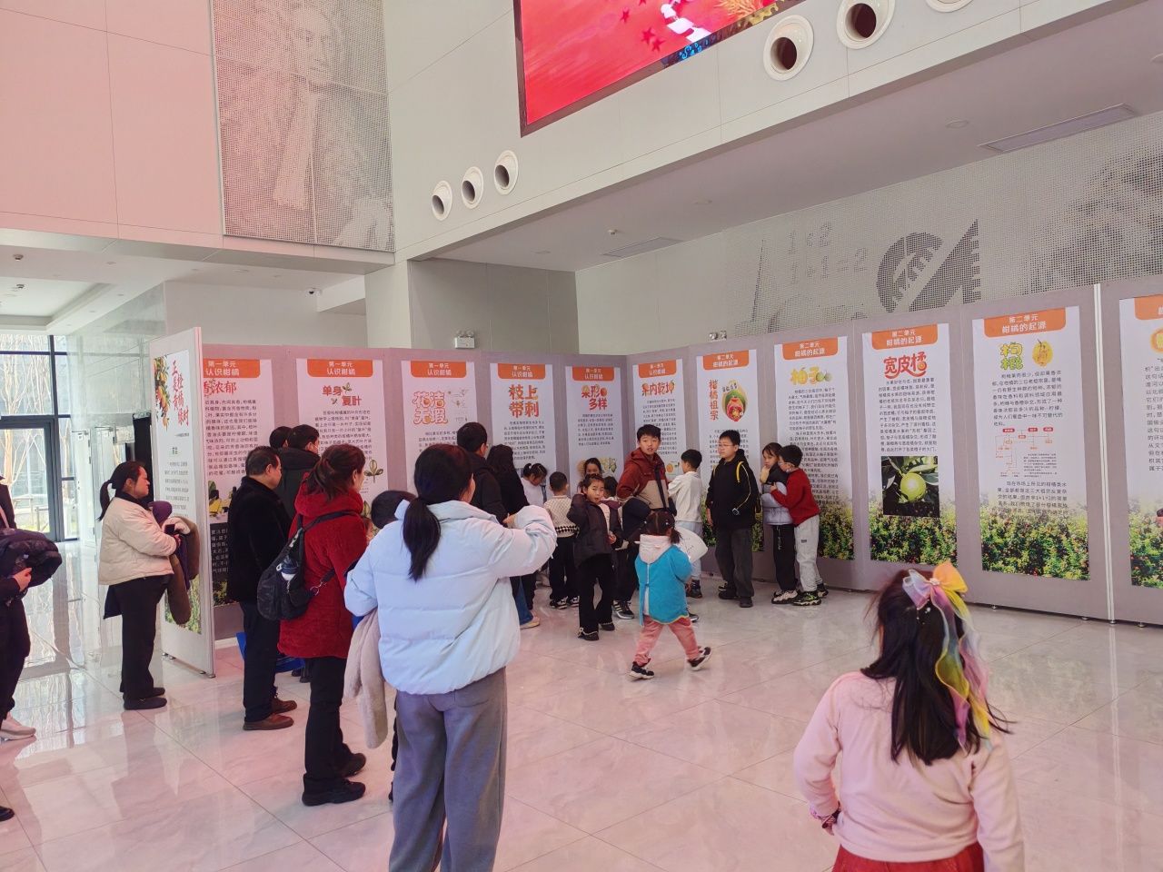 《正是橙黄橘绿时》临时展览仿若诗意自然之境,现场通过图片、实物与文字,全方位展示柑橘树的植物特征与物种进化。观众专注观察橘子的颜色、形状与大小,了解其生长环境与种植过程;从古诗词赞美到水果市场上琳琅满目的柑橘水果品种,让观众对柑橘有了全面的认识和了解。