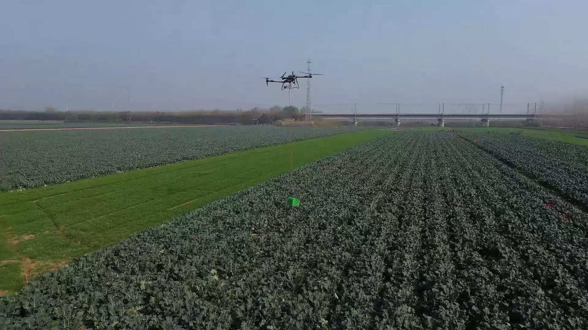 农用无人机正在田间运送蔬菜