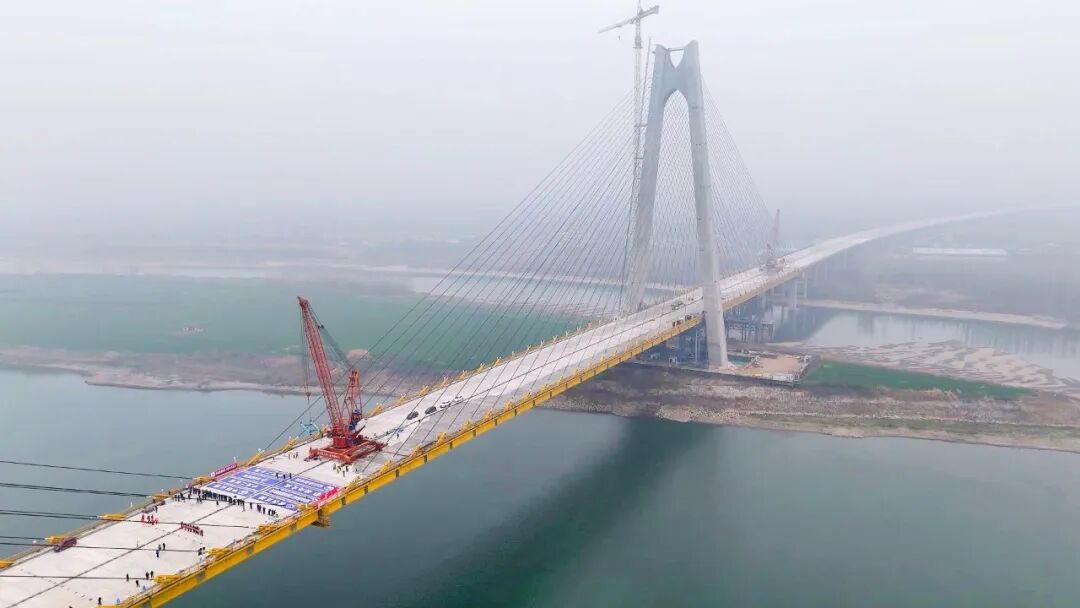 松滋河特大桥为双塔小边箱组合混合梁斜拉桥,全长995米,主跨555米,采用“A”字形结构,塔柱采用矩形倒圆角截面,寓意“楚服衣领”。大桥于2022年12月开工建设,期间项目团队先后攻克复杂地质条件下的深水桩基施工、大跨径钢梁线型控制等一系列技术难题。