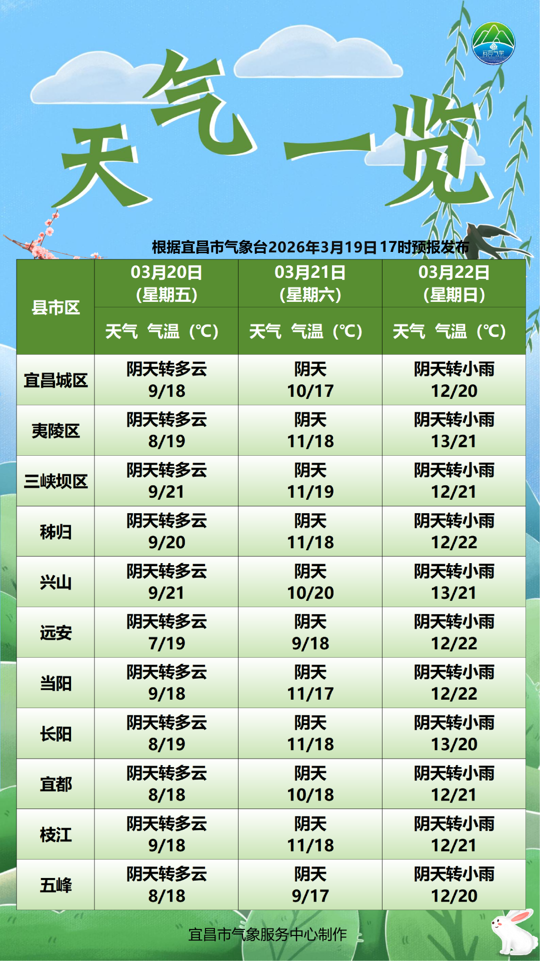 预计未来三天,宜昌市以多阴天为主,局部有短时小雨。