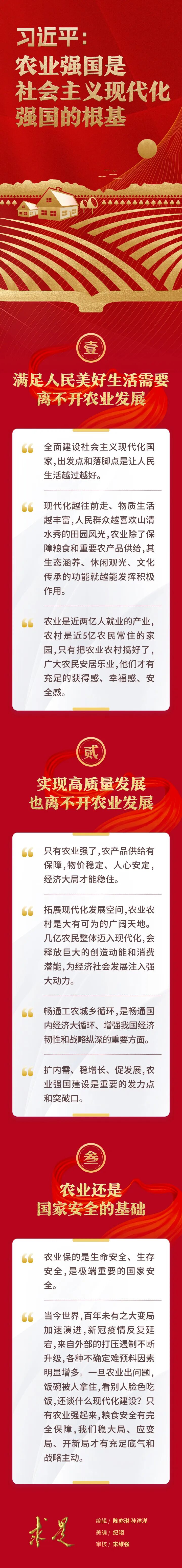 3月16日出版的2023年第6期《求是》杂志刊发习近平总书记重要文章《加快建设农业强国 推进农业农村现代化》。文章强调,“没有农业强国就没有整个现代化强国;没有农业农村现代化,社会主义现代化就是不全面的”,“必须深刻领会党中央这一战略部署,把加快建设农业强国摆上建设社会主义现代化强国的重要位置”。