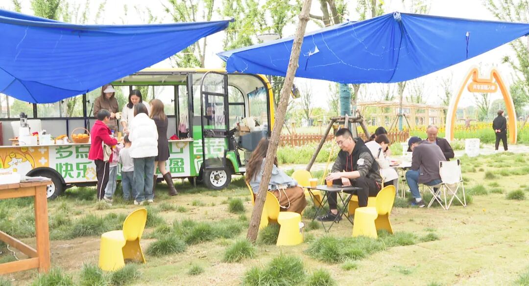 走进仙女吉吉主题公园,游客们正三五成群,拍照打卡、露营垂钓,享受休闲时光。一旁的游乐区,家长带着孩子们愉快玩耍,现场欢声笑语不断。