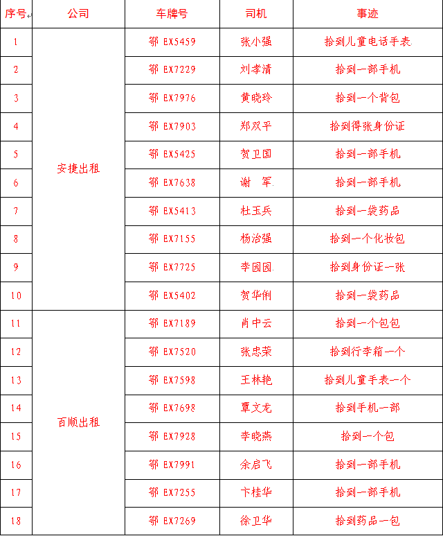 鄂EX7638驾驶员谢军(安捷出租):5月12日凌晨,谢师傅在车内拾得一部手机后,立即在公司群报备并发布招领信息。第二天,失主拨通遗失手机联系到谢师傅,谢师傅与乘客约定好时间地点后第一时间将手机交还。为谢师傅拾金不昧的精神点赞,特此表扬!