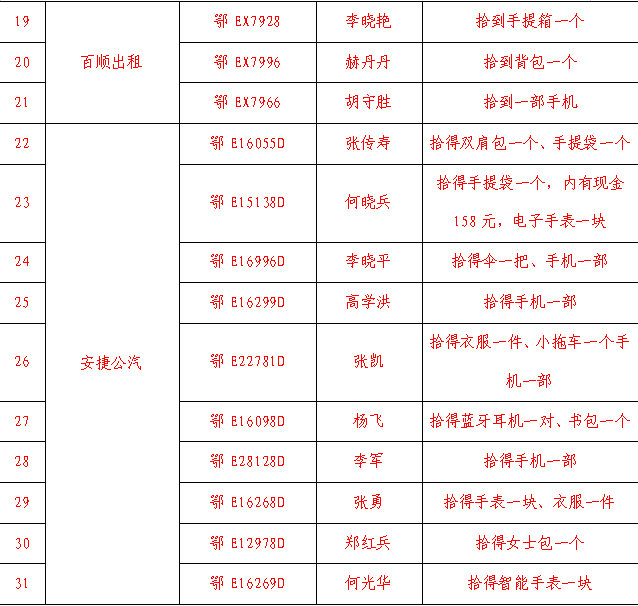 鄂EX7165驾驶员胡艳丽(百顺出租):5月10日,胡师傅在车上拾得一个黑色钱包,里面有多张银行卡、证件和少量现金,待与乘客取得联系,认真核对钱包内的物品信息无误后,胡师傅第一时间将钱包送还给失主。为胡师傅拾金不昧的精神点赞,特此表扬!