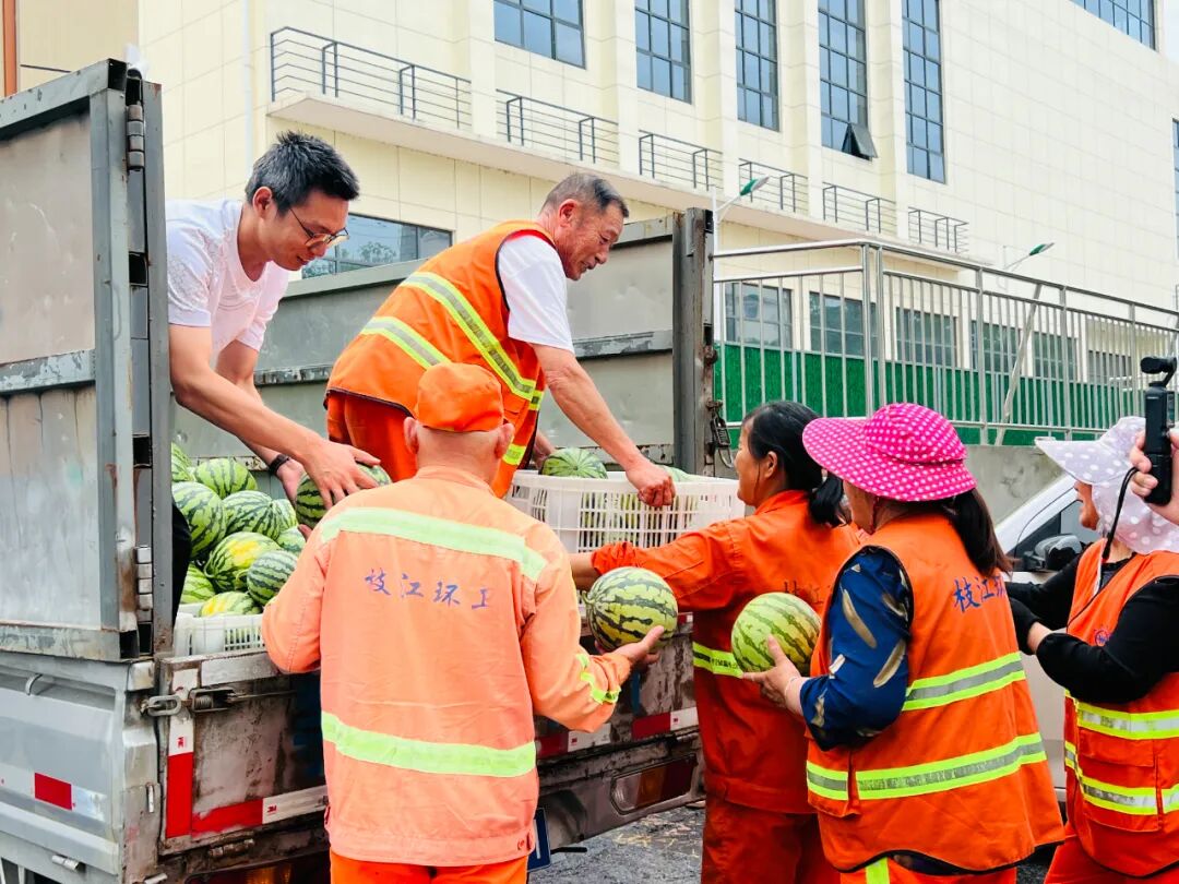 枝江融媒 “感谢环卫工人,你们辛苦啦!”6月7日上午, 湖北恒诚建设有限公司、枝江市永兴装饰有限公司、枝江市亮新新型建材有限公司对接白家岗村残疾小伙董羽瓜农,采购5000余斤西瓜送给坚守一线的环卫工人,在助农销售的同时,致敬高温下的坚守,为他们送去一丝丝清凉。