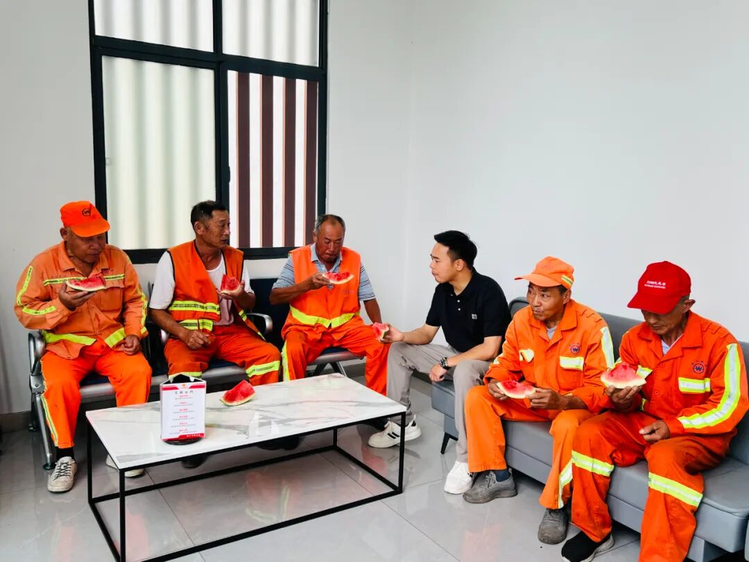 活动中,志愿者为每一位到达现场的环卫工人都热情地递上爱心西瓜,时时嘱咐大家在做好工作的同时,也要注意高温酷暑下的自我防护。