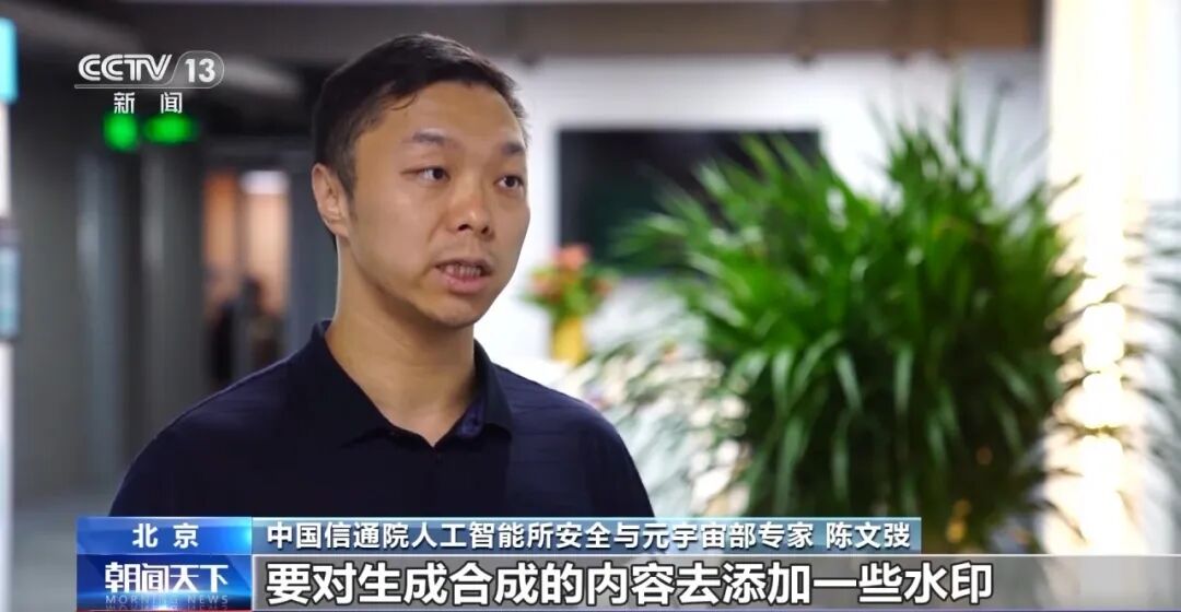 中国信通院人工智能所安全与元宇宙部专家 陈文弢:“要对生成合成的内容去添加一些水印,这个水印的本质其实就是要一方面去提示公众这个内容是由AI生成或者合成的,另一方面也是要追溯它的来源。”