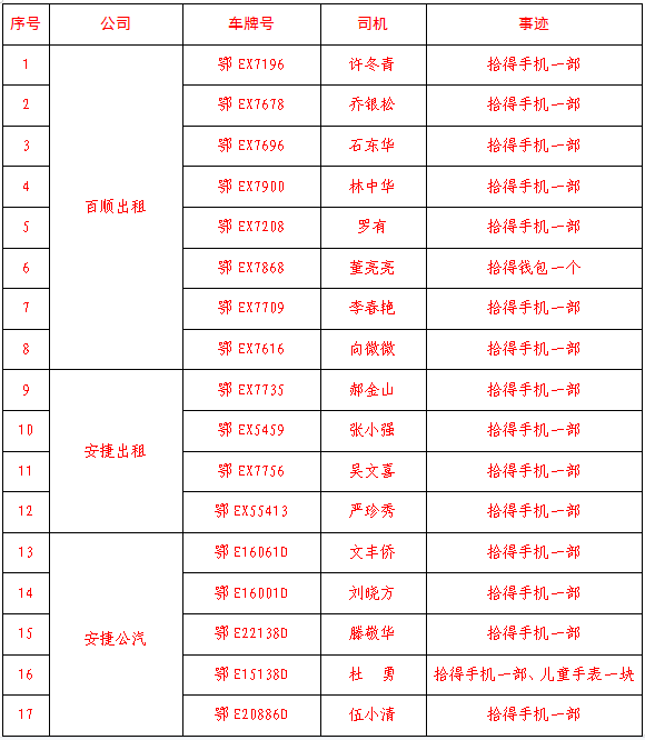 鄂EX7715驾驶员樊胜华(安捷出租):9月29日9时20分,樊胜华在车内拾得手机一部,并向公司报备。一小时后,失主拨打公司电话询问失物信息,在核实信息后,公司通知樊师傅与乘客联系,樊师傅和失主约定好位置和时间,将手机送还给失主。为樊师傅拾金不昧的精神点赞,特此表扬!