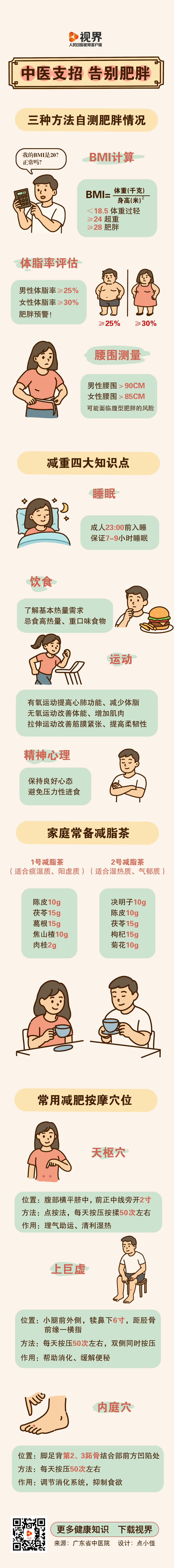 还在为肥胖烦恼?中医来支招啦! 一张图教你自测胖瘦,了解科普睡眠、饮食等减重知识,还有减脂茶和按摩穴位小窍门,助你轻松告别肥胖,速来解锁!