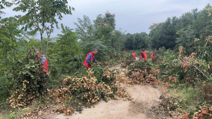 在乡村道路现场,身着红色志愿马甲的志愿者分工明确,有的负责搬运,有的负责清扫路面留下的树叶和树枝,确保现场秩序井然、安全可控。经过半天的努力,共清理树枝两处,有效消除了道路安全隐患,提升了道路的整洁度与美观度。