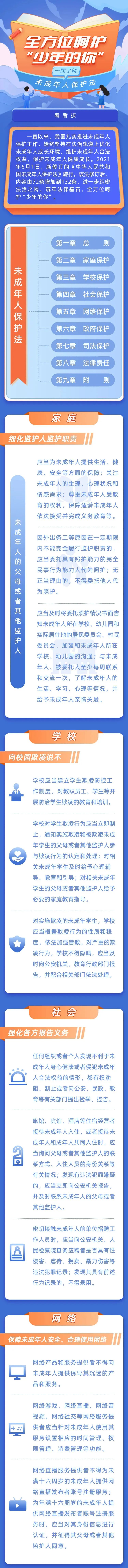 在新学期来临之际,一图了解《中华人民共和国未成年人保护法》,广泛普及未成年人保护相关法律法规,引导青少年健康成长,营造全社会关心关爱、支持参与未成年人健康成长的浓厚氛围。