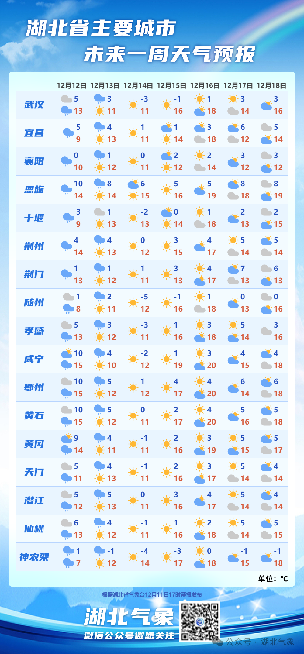 12月13日08时-14日08时,全省多云到晴天,白天恩施南部有短时小雨、高海拔地区有雨夹雪或雪。最高气温10~15℃,最低气温北部-5~-2℃、南部-2~3℃,偏北风3到4级、阵风5到8级,晚上转2到3级。