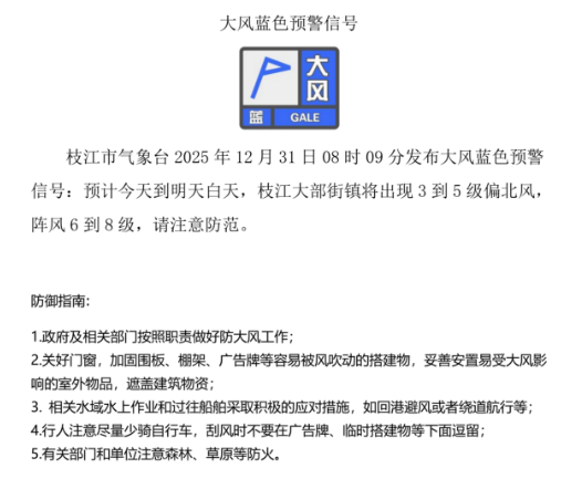 枝江市气象台发布大风蓝色预警信号,请注意防范