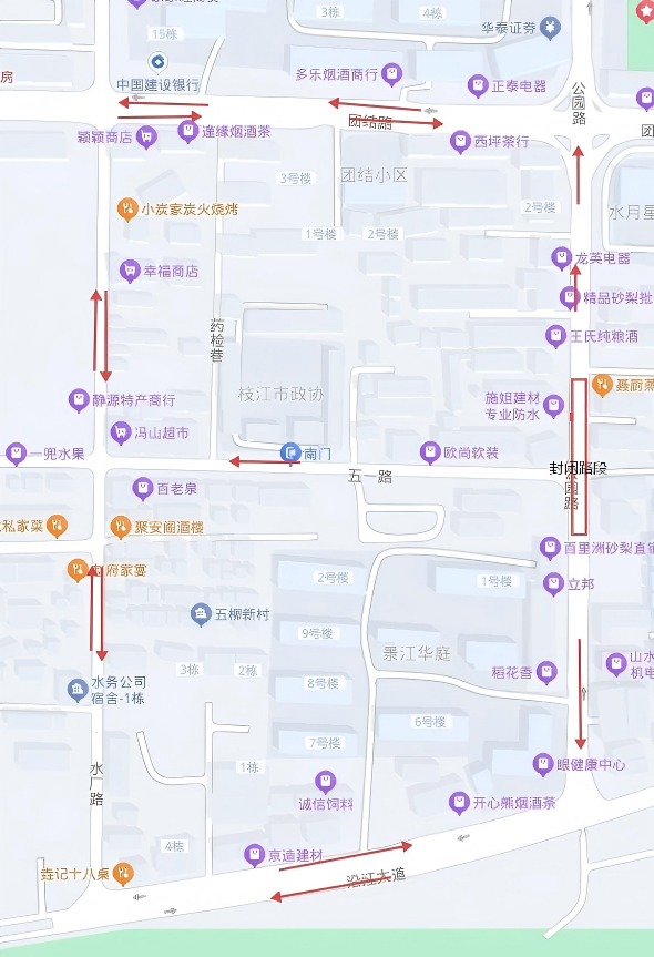 团结路与沿江大道建议绕行路线:团结路/沿江大道→水厂路→沿江大道/团结路(见图)