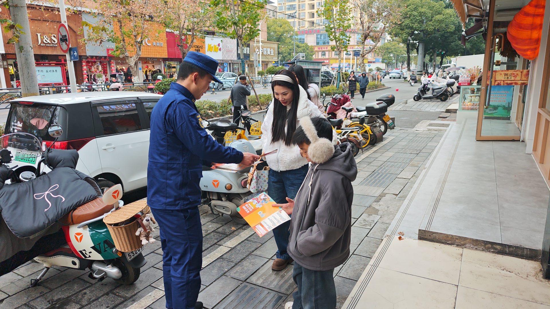 活动中,宣传人员与商户负责人及店员面对面交流,结合冬季天干物燥、用火用电用气需求增加的火灾特点,重点讲解违规住人、私拉乱接电线、违规使用大功率取暖设备、堵塞消防通道等常见隐患的危害性。针对商铺货物堆放密集、用电设备多的实际情况,宣传人员手把手指导商户正确检查电路线路、规范使用灭火器,提醒大家及时清理店内及门口的纸箱、塑料瓶等易燃杂物,严格落实“人走电断、火熄气关”的安全准则。