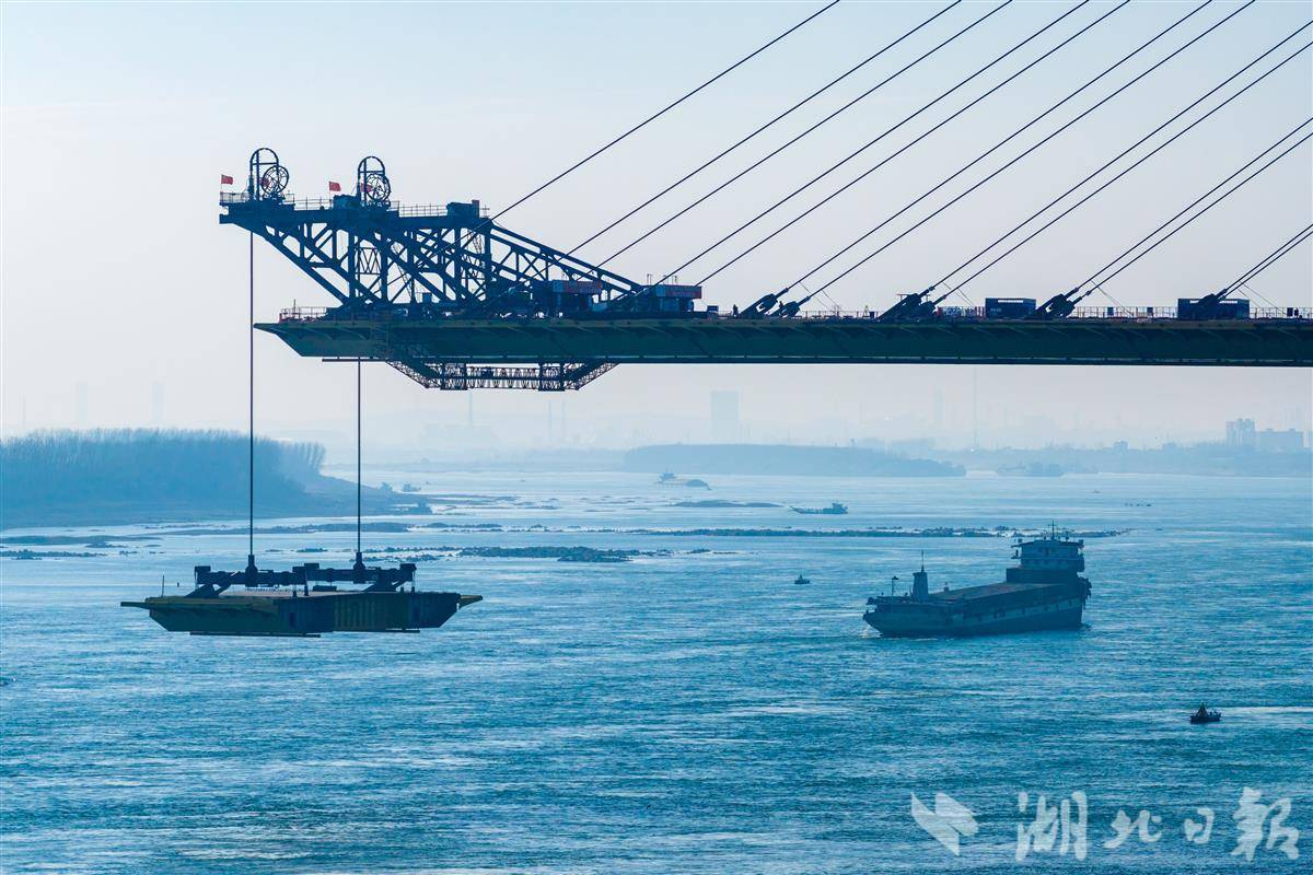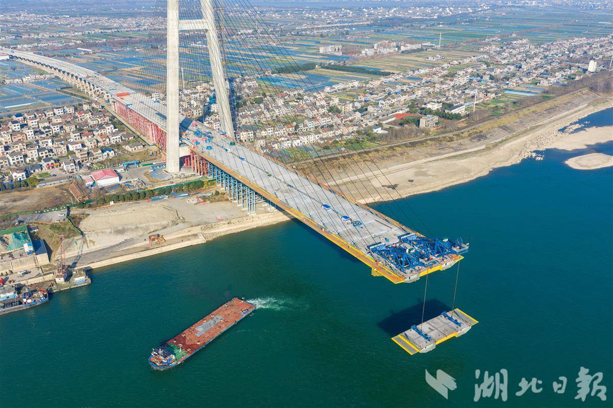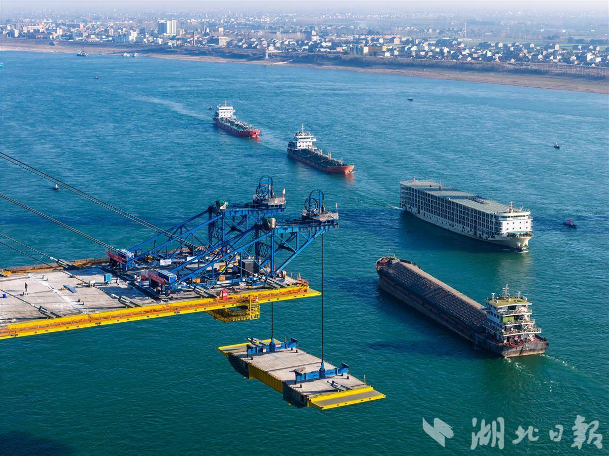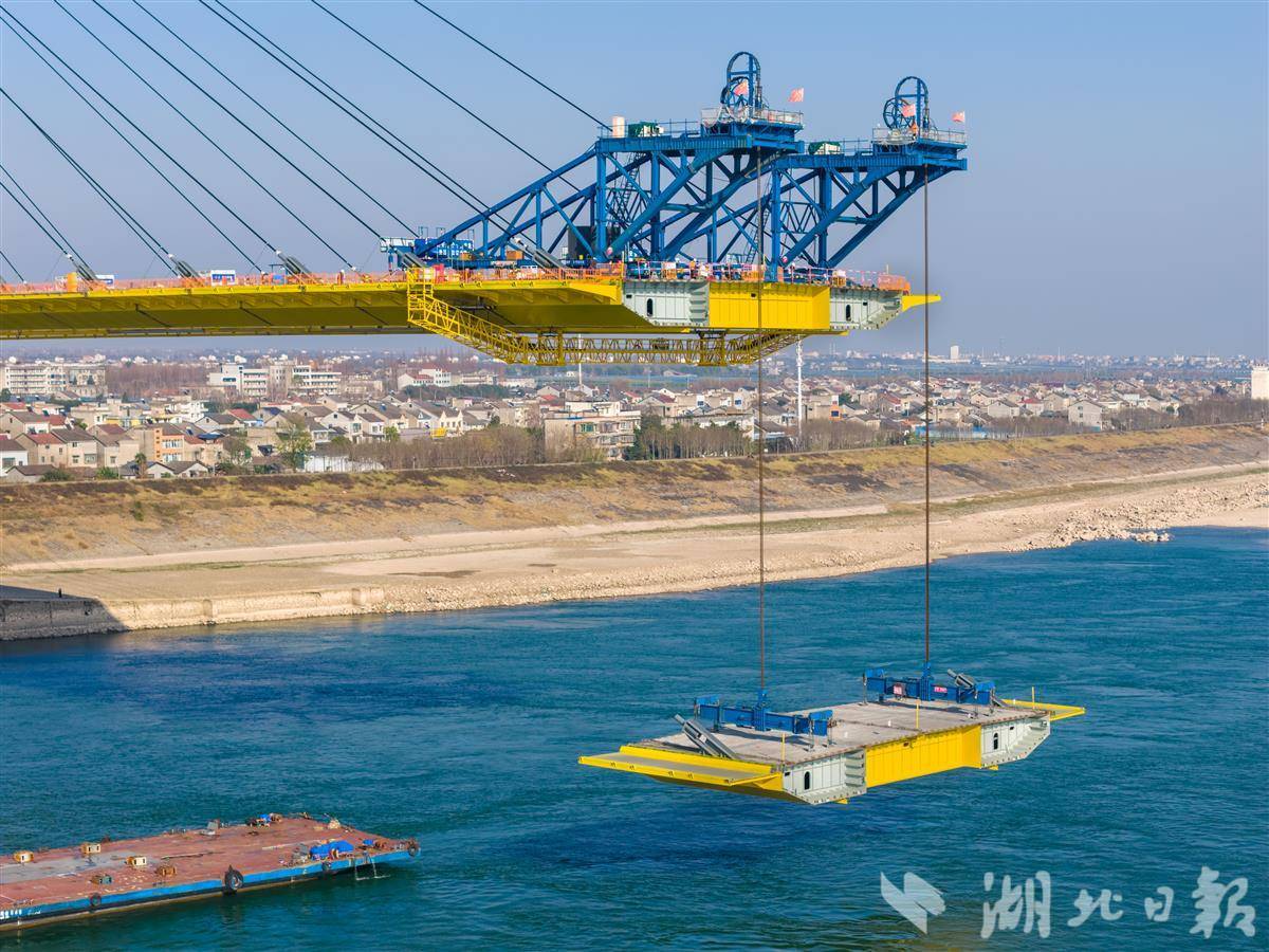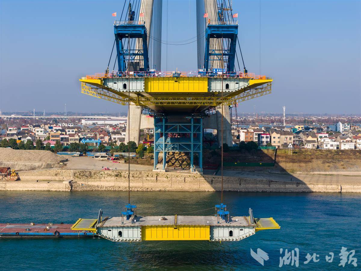 1月7日,枝江长江大桥施工现场一派繁忙,钢箱梁吊装作业有序推进。目前,南北两岸主桥段施工同步推进,项目上部结构钢箱梁吊装进入关键阶段,平均每6天完成一片钢箱梁吊装。枝江长江大桥是当枝松高速公路的控制性工程,大桥全长1549米,主跨890米,双向六车道,是目前世界最大跨径钢-UHPC组合梁斜拉桥。大桥建成后,将进一步优化长江中游过江通道布局,为湖北长江经济带发展与中部地区崛起提供坚实支撑,助力谱写区域高质量发展的新篇章。