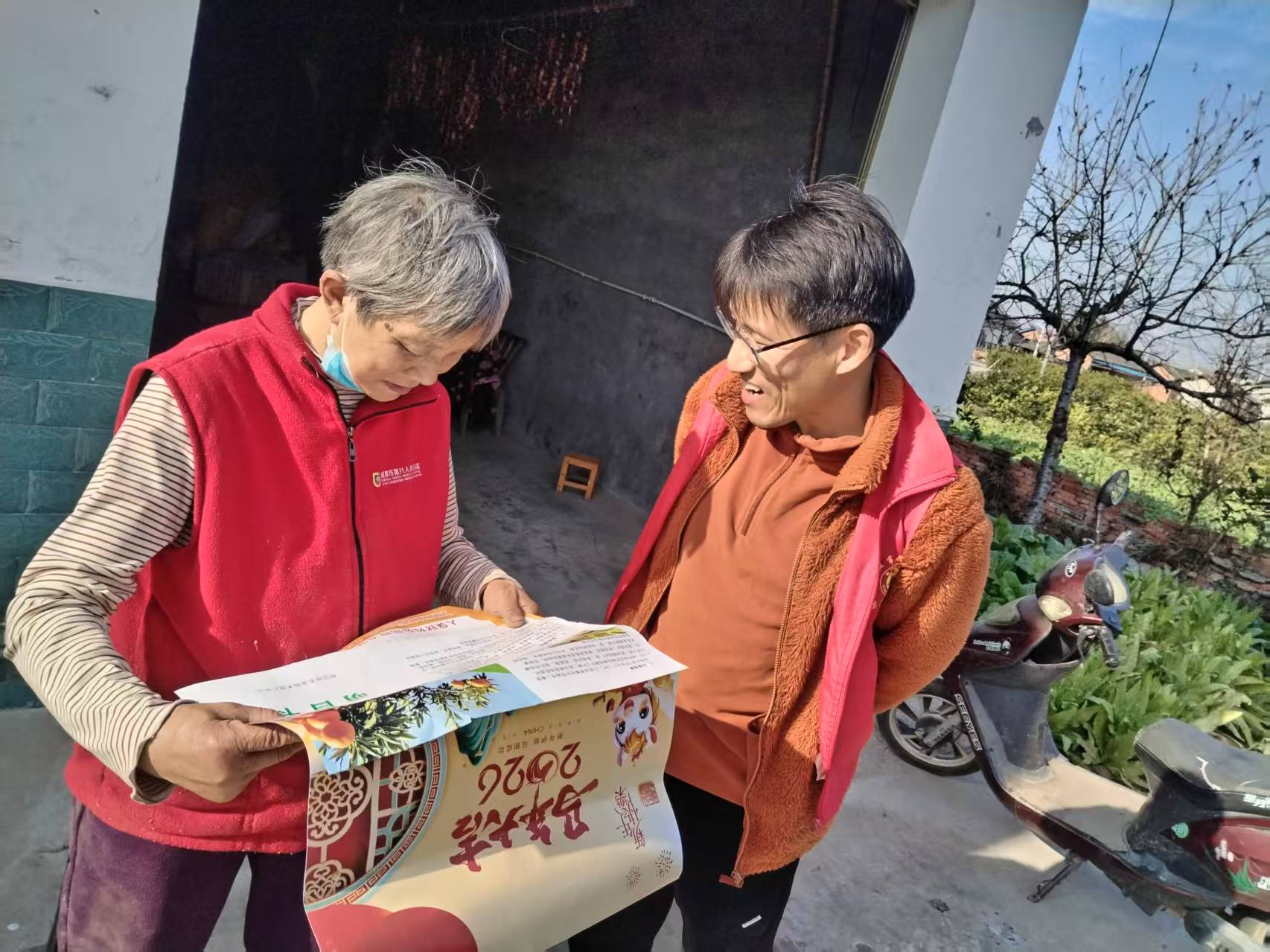 胡维芹接过红彤彤的年画和政策宣传单,翻看着上面的内容,感慨道:“书记和村干部不光来给我们讲政策解难题,还送了年画,心里又暖又踏实!”年画里的新春喜庆,与政策宣讲的民生温度交织,让这个冬日的农家小院格外温馨。