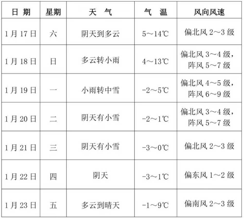 未来一周(1月17-23日),我市18日夜间至21日有一次寒潮大风雨雪冰冻天气过程,降水相态复杂,气温下降明显。