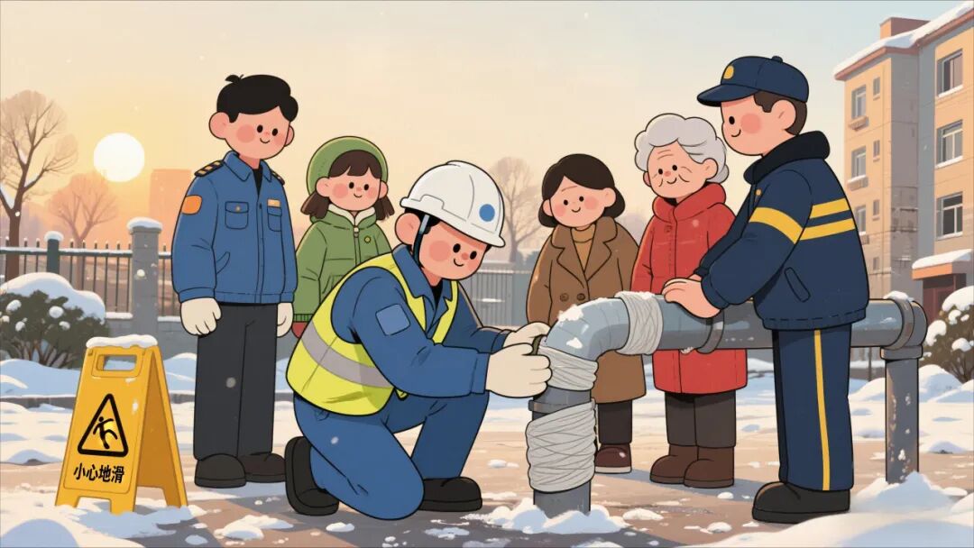 温馨提示:对于共同使用的集中水表井和公共供水设施,要有集体意识,共同爱护维护,采用同样的办法保温。