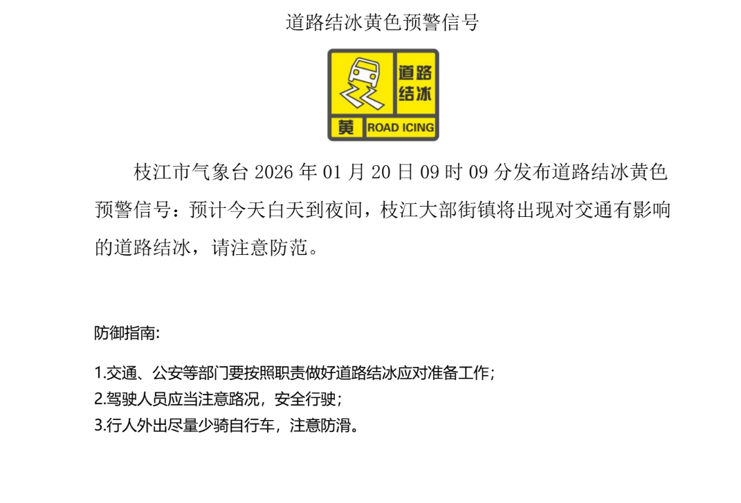 枝江市气象台2026年1月20日09时09分发布道路结冰黄色预警信号:预计今天白天到夜间,枝江大部街镇将出现对交通有影响的道路结冰,请注意防范。