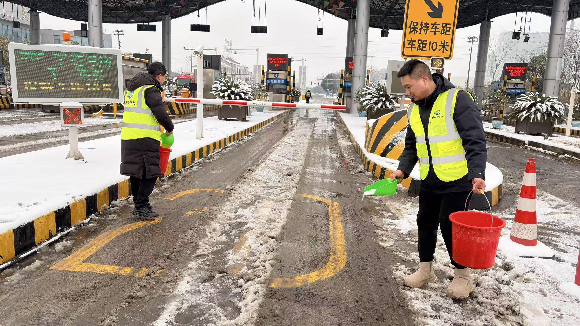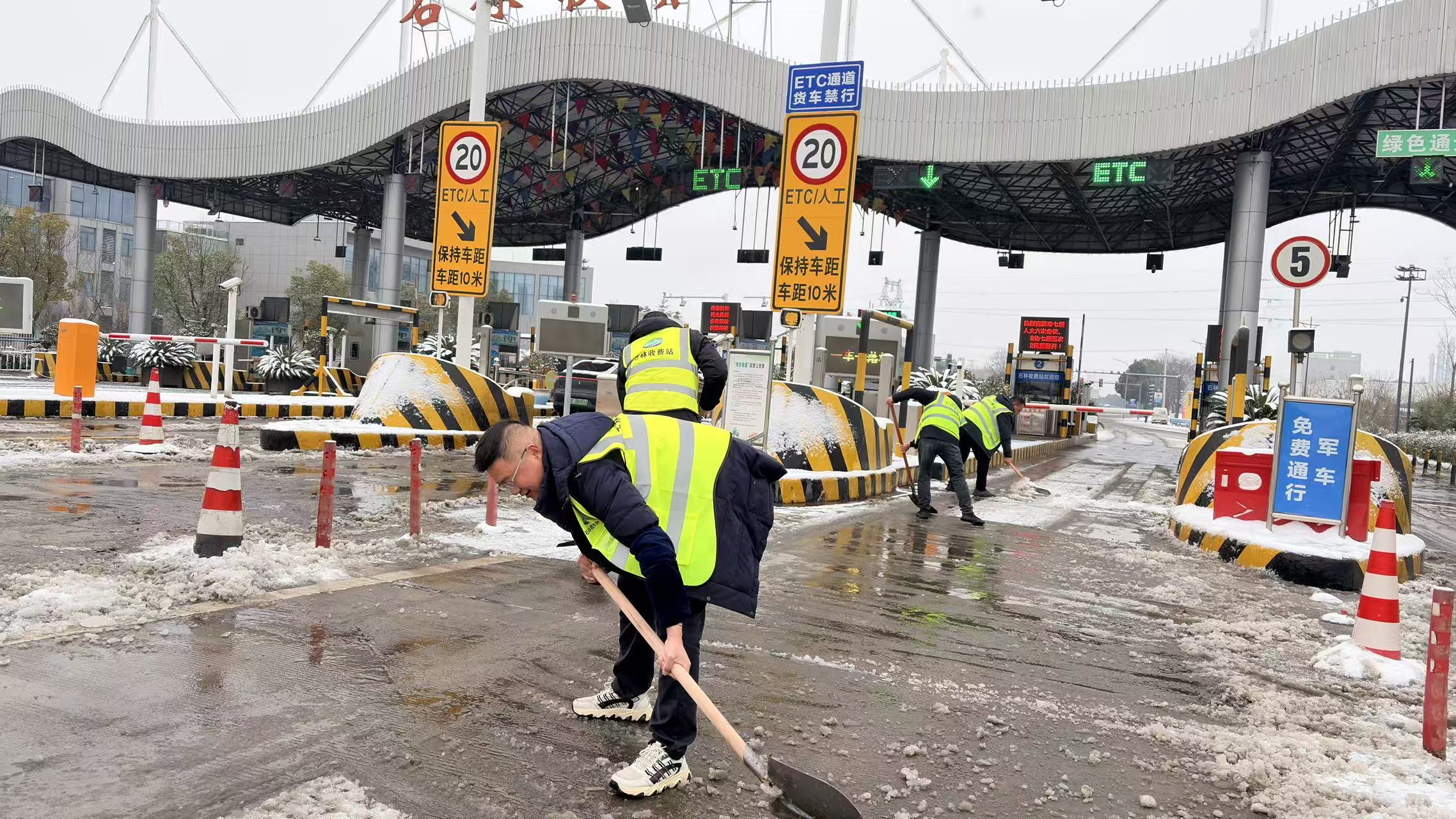 枝江融媒 1月20日上午,新一轮低温雨雪冰冻天气来袭,石林收费站快速反应,组织班组当班人员,第一时间对行车道及收费广场进行撒盐融雪,利用铁锹、锄头等除雪工具,集中对收费广场、车道重点部位进行清理,确保车辆安全通过、站口畅通。同时,做好对司乘人员的便民服务和相关解释工作,全力保证车道安全畅通。