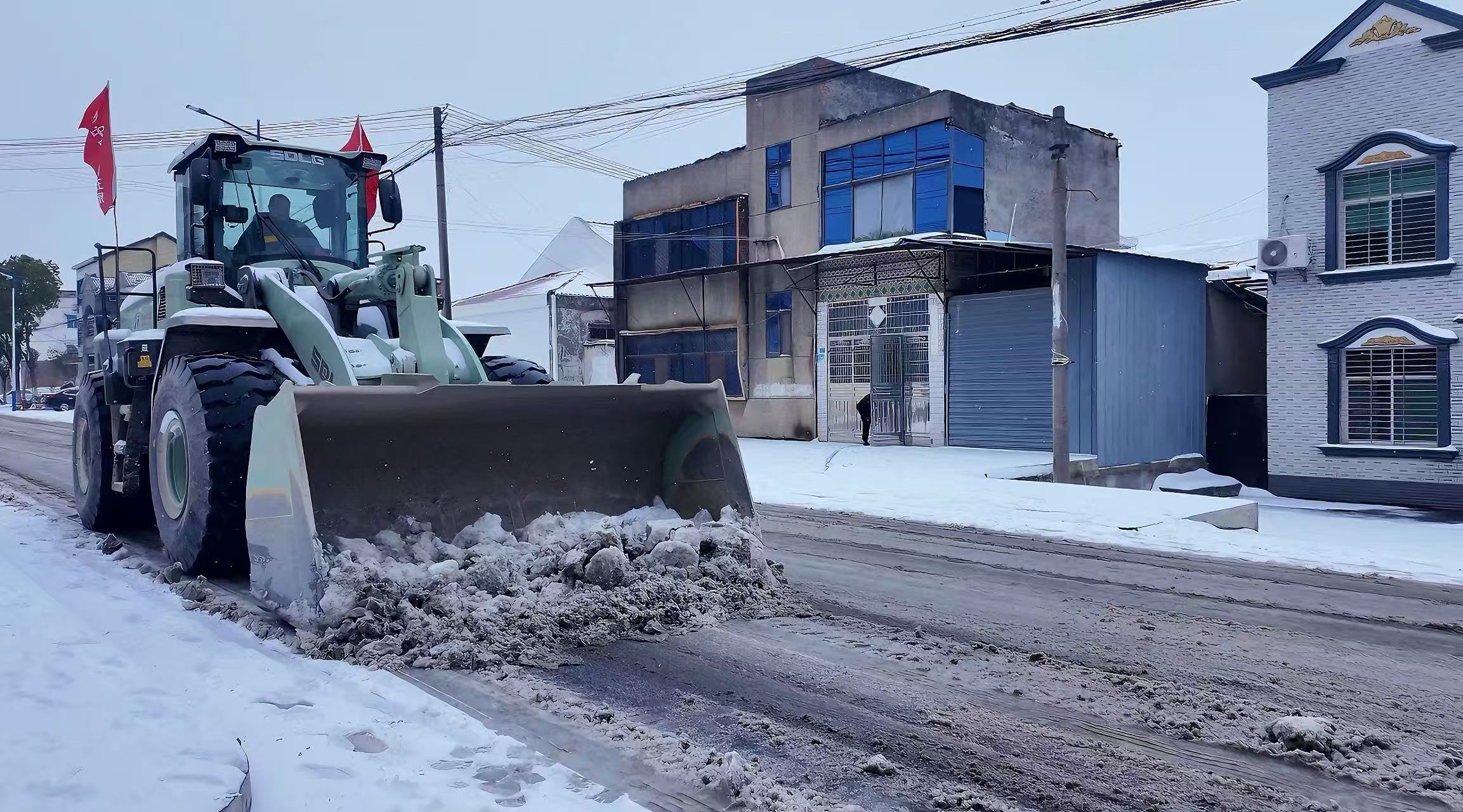 行动中,该镇凝聚多方力量,组建起900余人的抗雪队伍,调配铲车21辆,足额配备铁锹、融雪剂等应急物资,聚焦镇村主干道、急弯陡坡等关键区域,全方位开展融冰除雪作业。工作人员顶风冒雪、分工协作,机械铲雪与人工清扫同步推进,累计作业里程达30公里,撒布融雪剂2.5吨。同时,安排专人在重点路段定点值守,实时疏导交通、提醒过往车辆行人注意安全,切实打通群众出行 “安全通道”。