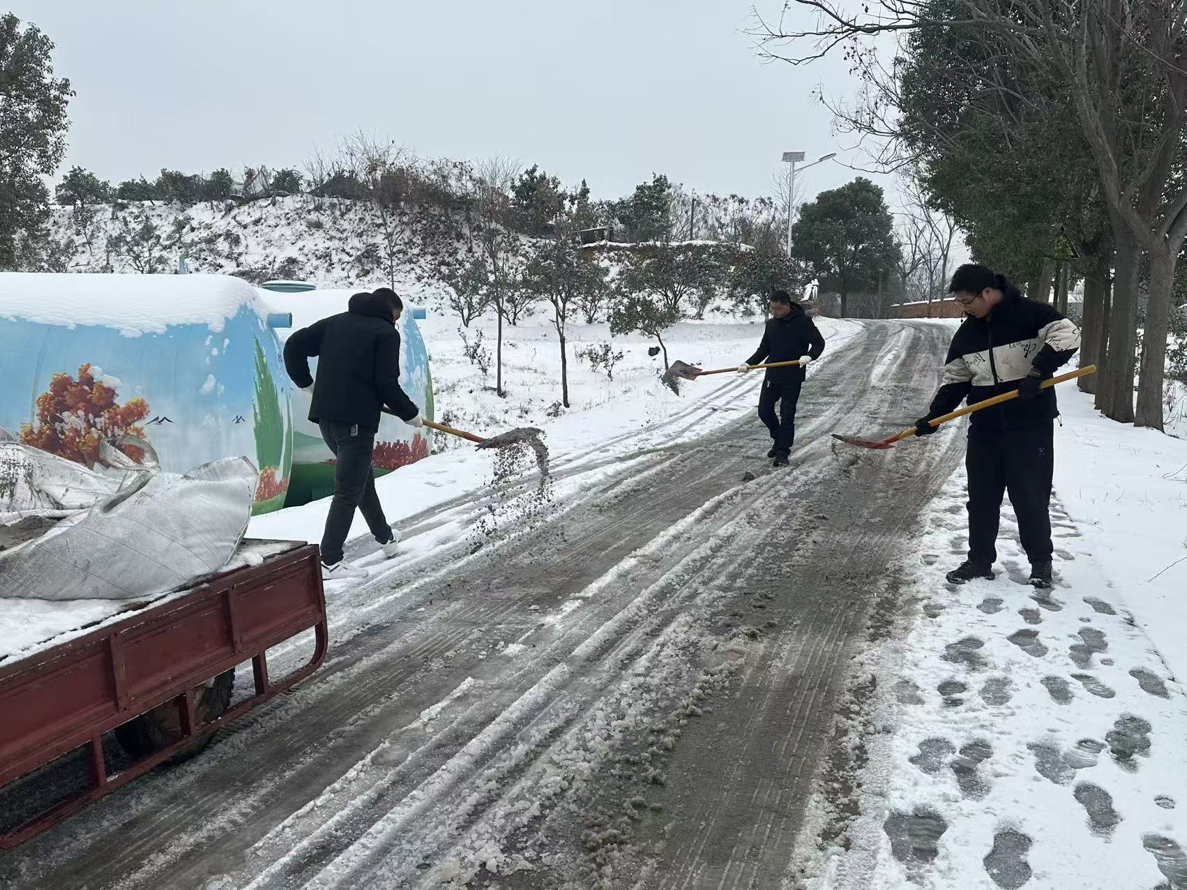 降雪伊始,村“两委”立即启动应急预案。由驻村第一书记、村党支部书记带头,组建应急清雪小队,调配工业盐、铁锹、扫帚等物资,重点清扫村口、主干道、急弯陡坡及村民活动广场等关键路段与区域。过程中,村干部及党员们顶风冒雪,齐心协力,通过人工清扫与撒盐防冻相结合的方式,有效防止道路结冰,及时消除了安全隐患。