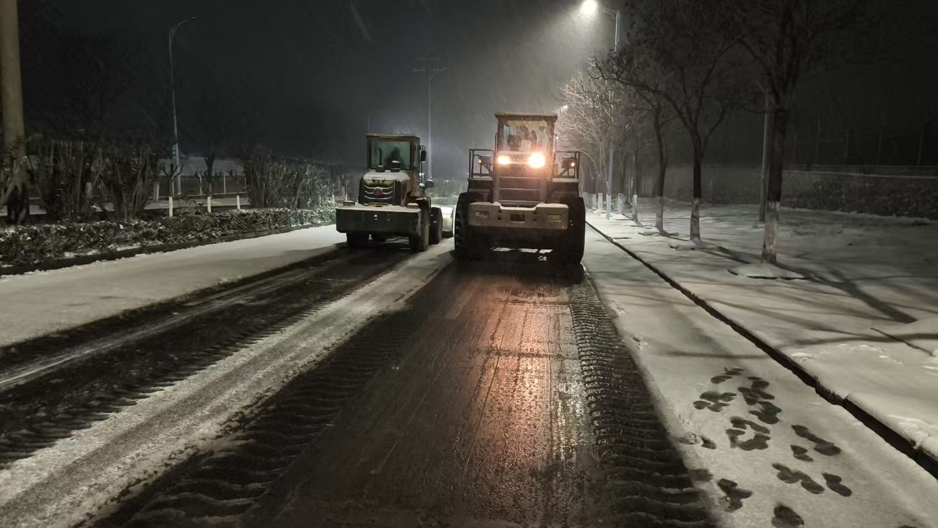 港化集团配合高新区提前在关键点位布设融雪物资,针对重点坡道、易滑路段开展融雪剂撒布作业,累计使用工业盐100余袋,累计覆盖道路约200公里;同时联动姚家港园区企业调配铲车、撒布机等机械设备10余台,累计完成80余公里除雪融冰任务,应急设备与人员全程待命值守,确保响应及时、处置高效。