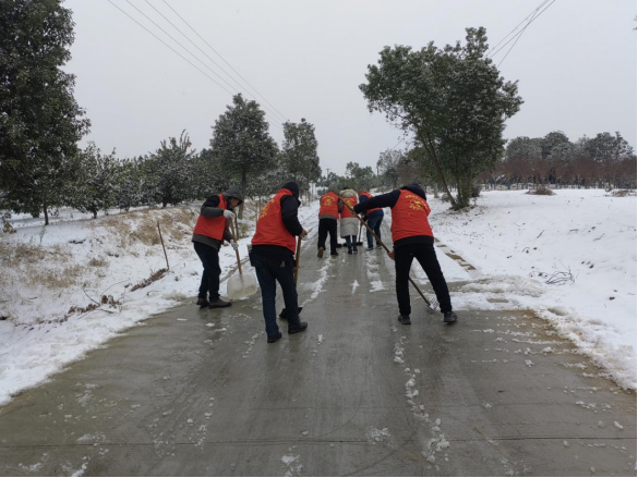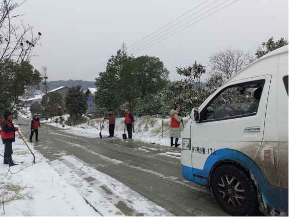 紫杨路是连接紫荆岭村和杨家店村的交通要道,途经上柏坪村,来往车辆频繁。其中余家咀路段坡陡且长,坡面冰雪成为车辆上下坡的安全隐患。志愿者从坡底一路行进至坡顶,清除近1000米道路积冰。他们分工协作,或破冰、或铲雪、或清理积雪冰水,高效推进清雪工作。