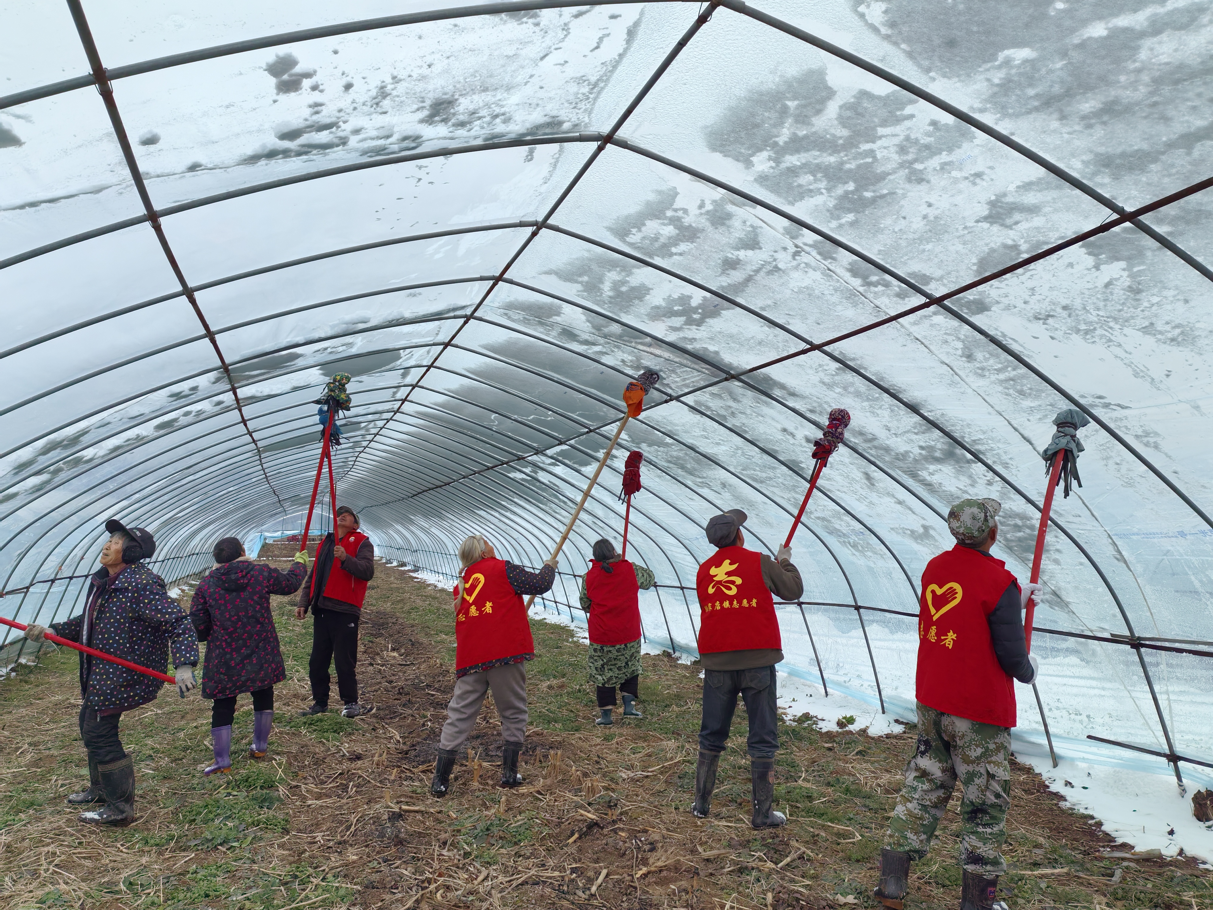 险情就是命令,民生重于泰山。第一书记第一时间召集村干部与村公益性岗位人员,火速组建志愿服务队。考虑到铁锹、笤帚质地坚硬,直接使用易划破大棚薄膜,大家当即找来家里闲置的旧衣服,现场裁剪后包裹在工具头部,制作出柔软不伤膜的除雪工具。队员们带着改造后的工具奔赴大棚基地,顶风冒雪投入除雪战斗。大家分工协作,有的用包裹旧衣的铁锹轻轻铲除棚顶厚雪,有的用缠布笤帚从内往外轻顶薄膜让雪松动后自动滑落,对全村19个蔬菜大棚开展不间断除雪作业。寒风吹红了脸颊,雪水浸湿了鞋袜,队员们却丝毫没有退缩,经过4个小时的持续奋战,成功清除所有大棚积雪,最大限度减少了大棚损失。