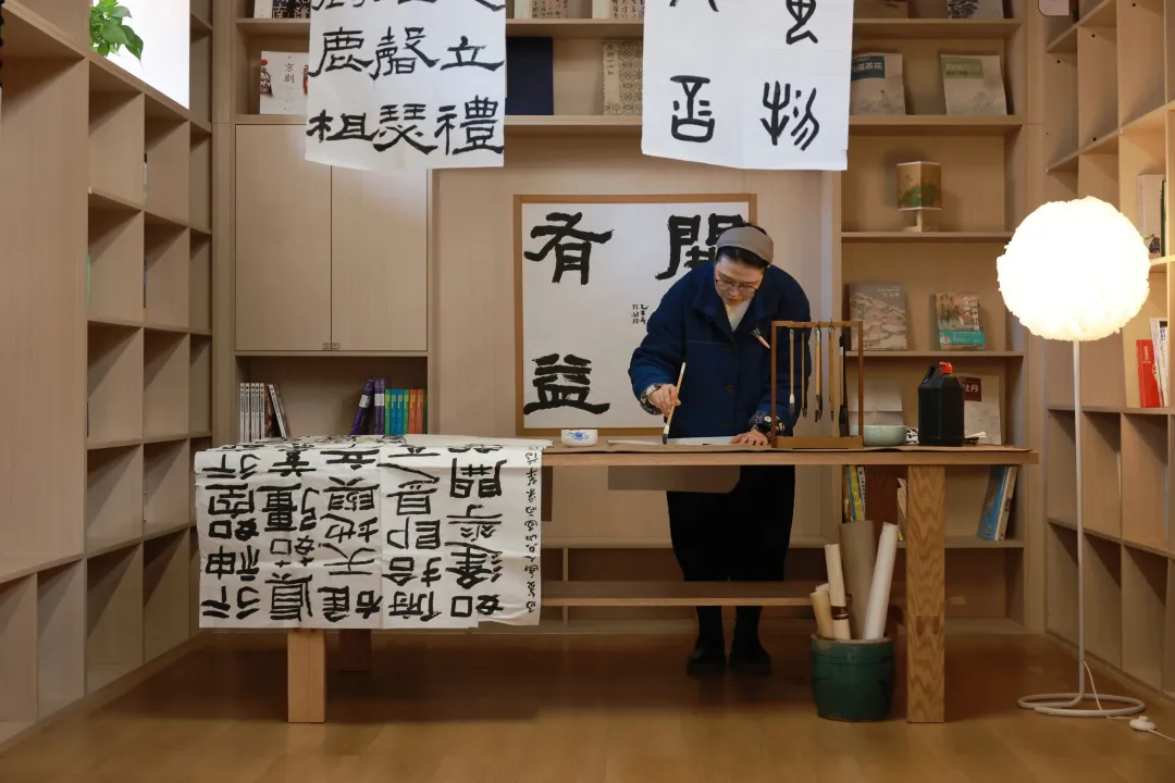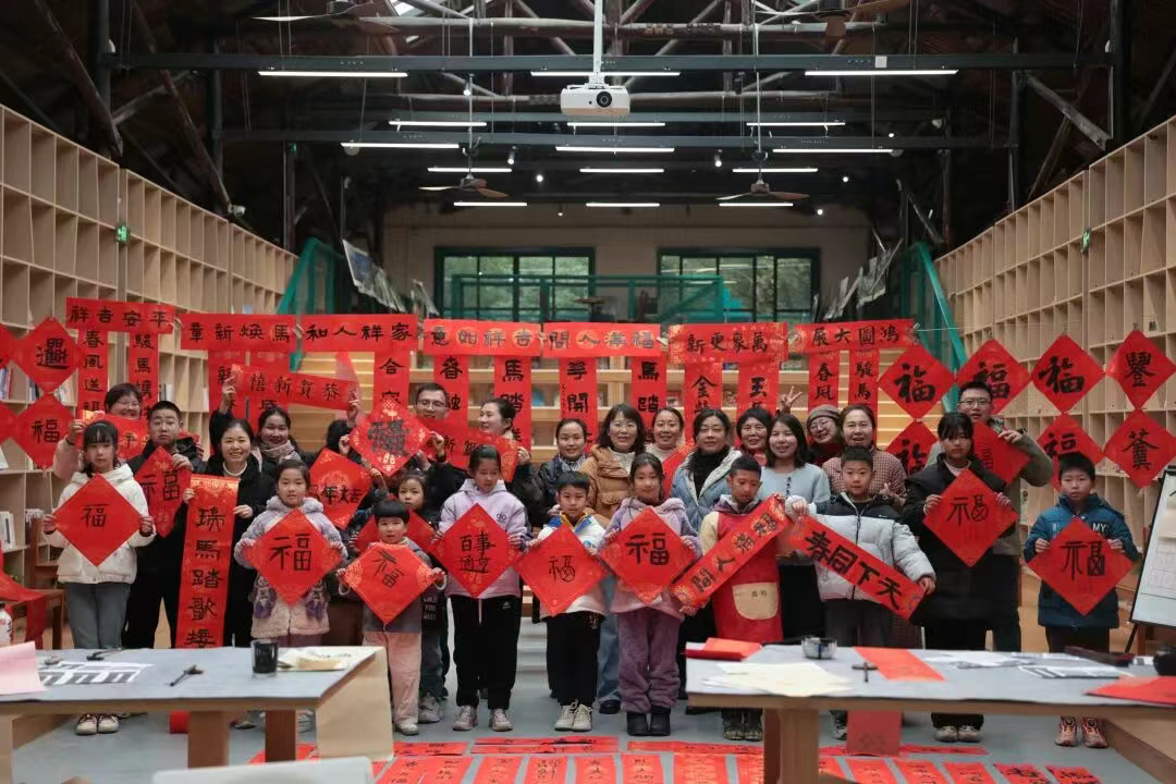 创作过程中,两位老师穿梭其间,不时俯身指导,纠正握笔姿势,示范书写要领。小朋友们虽笔触稚嫩,但一板一眼,认真劲十足;大人们也全情投入,力求写出最满意的春联。一时间,书店内笔走龙蛇,红纸翻飞,一幅幅寓意吉祥的春联和一个个饱满圆润的“福”字在笔下诞生。
