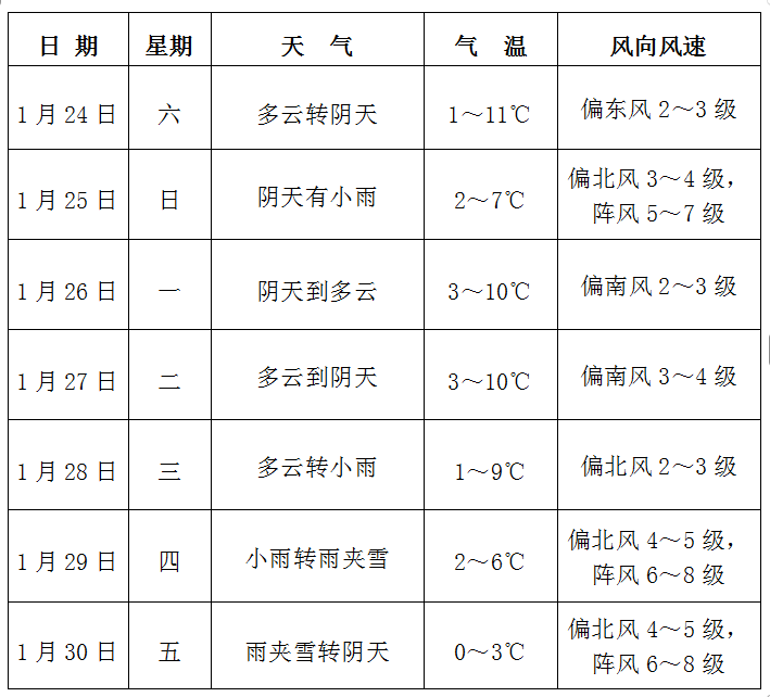 枝江未来一周天气预报(1月24日-30日)