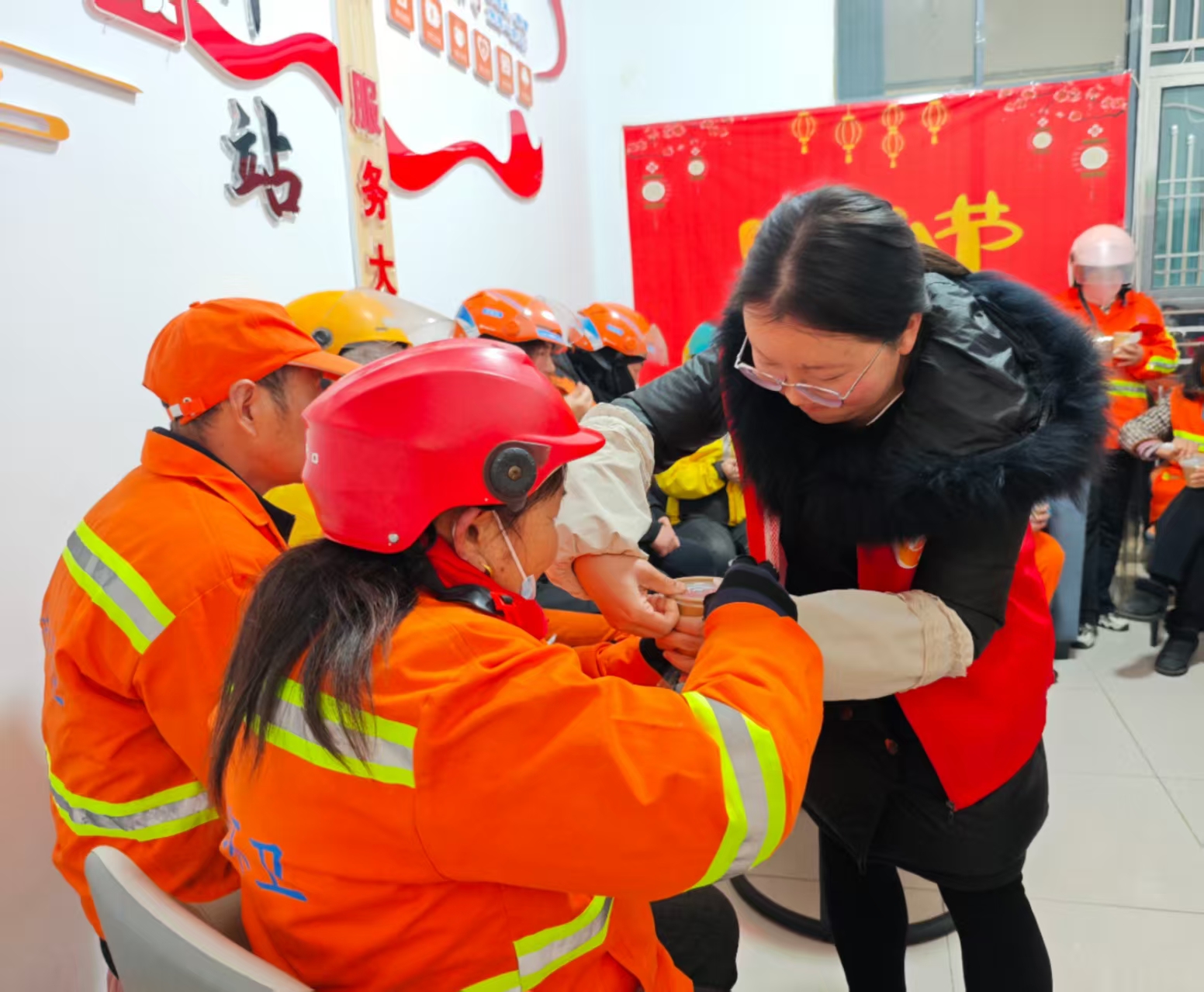 活动现场,一副由大家共同构思、代表驿站心声的春联被精心张贴上门框——“暖驿粥到情亦到,驿站春来福同来”,横批“腊八同欢”。红纸黑字间,凝聚着对劳动者深深的敬意与节日祝福。