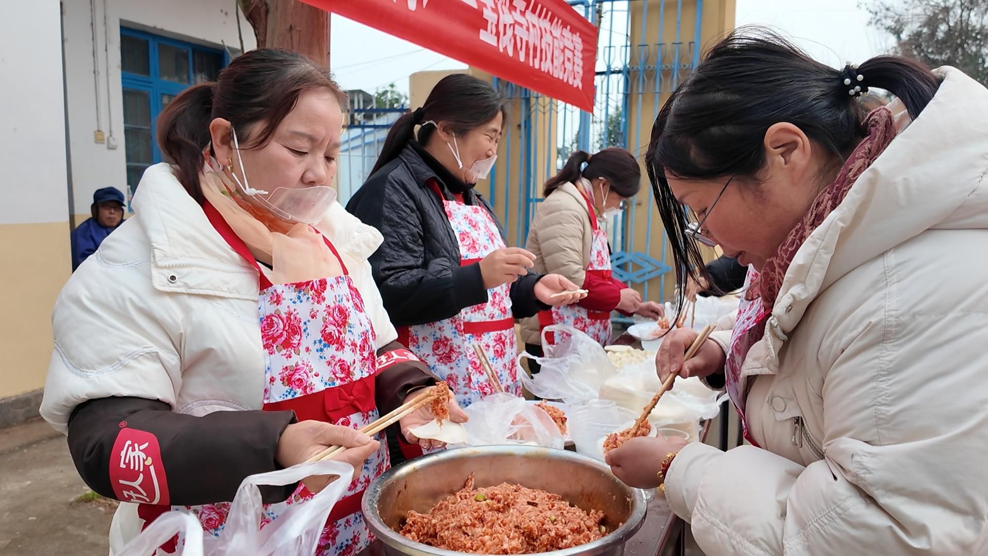 演出间隙,政策宣传、健康知识有奖问答环节互动热烈,村民们踊跃举手、积极抢答,在轻松愉悦的氛围中学习实用知识、收获新春惊喜。与此同时,现场包饺子、品饺子活动同步开展,团圆宴上,热气腾腾的水饺、腊八粥等特色美食摆满餐桌,村民们围坐在一起,边吃边聊,暖意融融。