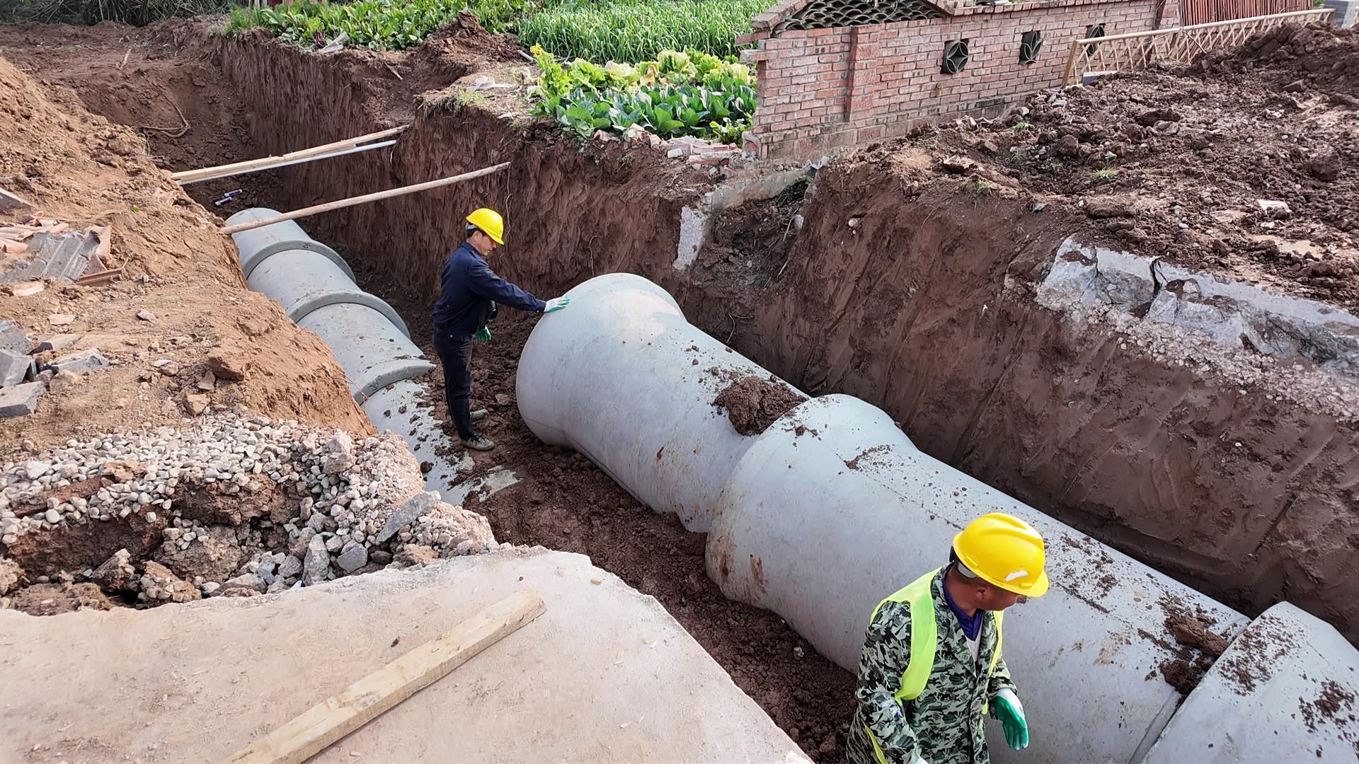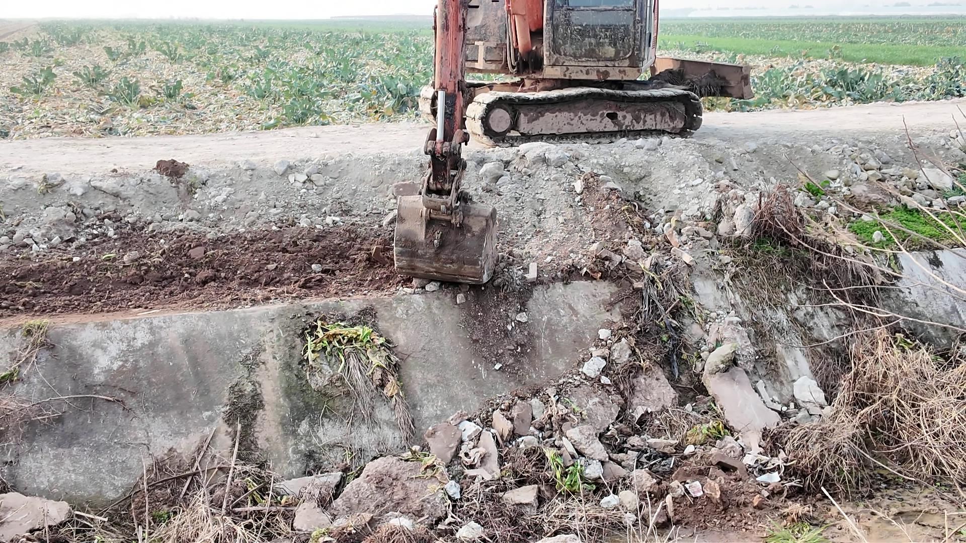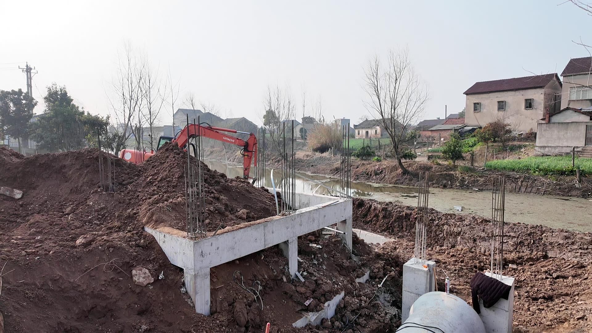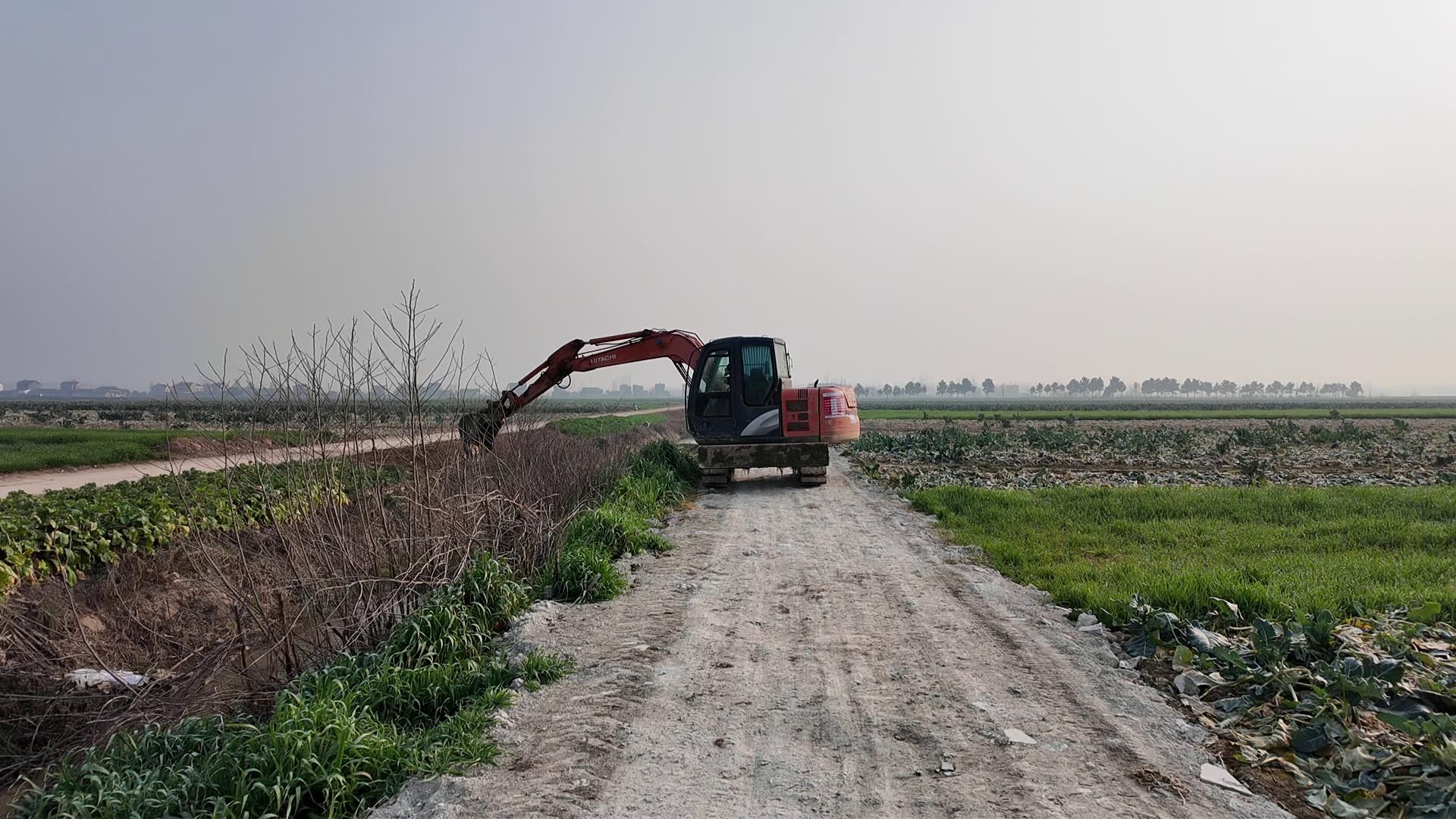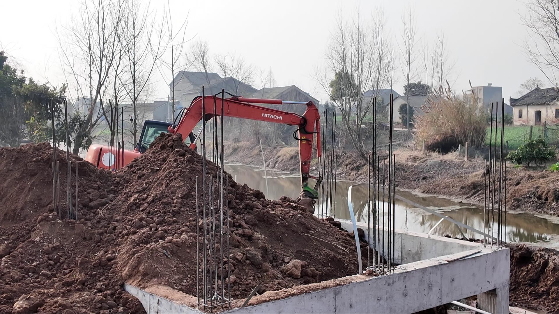 在张家场村的泵站建设现场,工人们正进行泵房基础土方回填和水泥涵管铺设,泵房主体工程预计农历年底前完成。沟渠和堰塘的清淤整治工作也进入冲刺阶段,预计本月底完工。