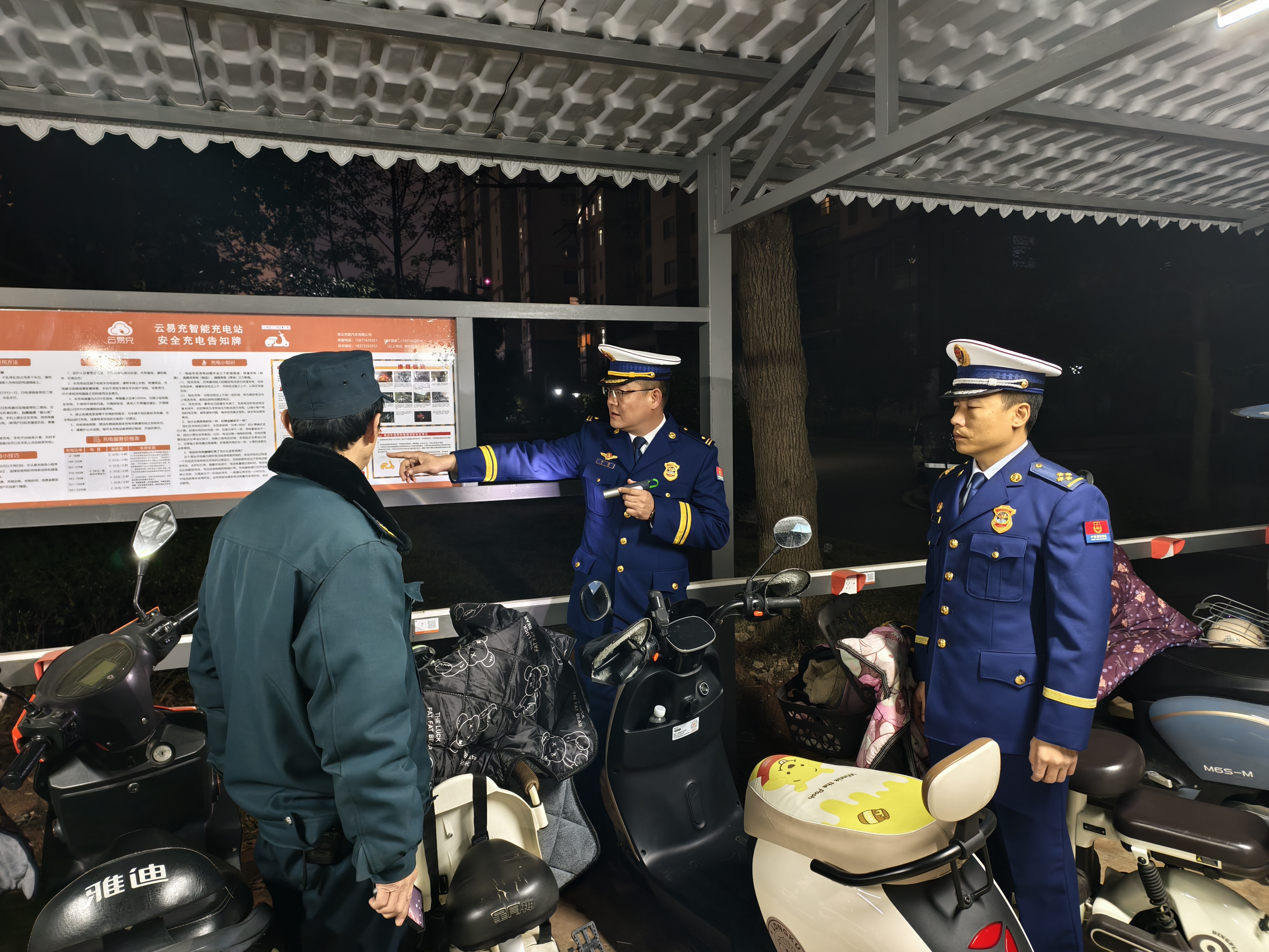 此次夜巡紧盯高层住宅小区消防控制室值班值守、自动消防设施运行状况、电动自行车停放充电、疏散通道畅通情况等关键环节,重点排查电动自行车违规进楼充电、楼道堆放杂物、消防设施器材失效等突出隐患。检查中,工作人员坚持“边检查、边指导、边整改”,现场督促指导物业服务企业立即整改存在的隐患问题。针对电动自行车“进楼入户”“飞线充电”等高频隐患,检查人员逐栋巡查单元门厅、楼梯间等重点区域,对发现的违规行为当场劝阻整改。