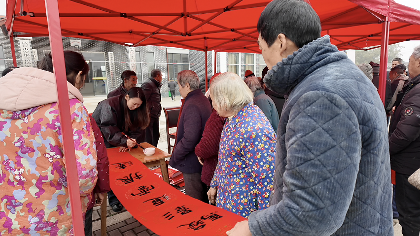 在杨家店村,村民们自觉排起整齐的队伍,现场秩序井然。书法老师们根据村民的需求,量身书写个性化春联,黑色的墨汁在红色的宣纸上晕染开来,字字饱含对新年的美好期许。村民们手持刚写好的春联,小心翼翼地晾晒在一旁。