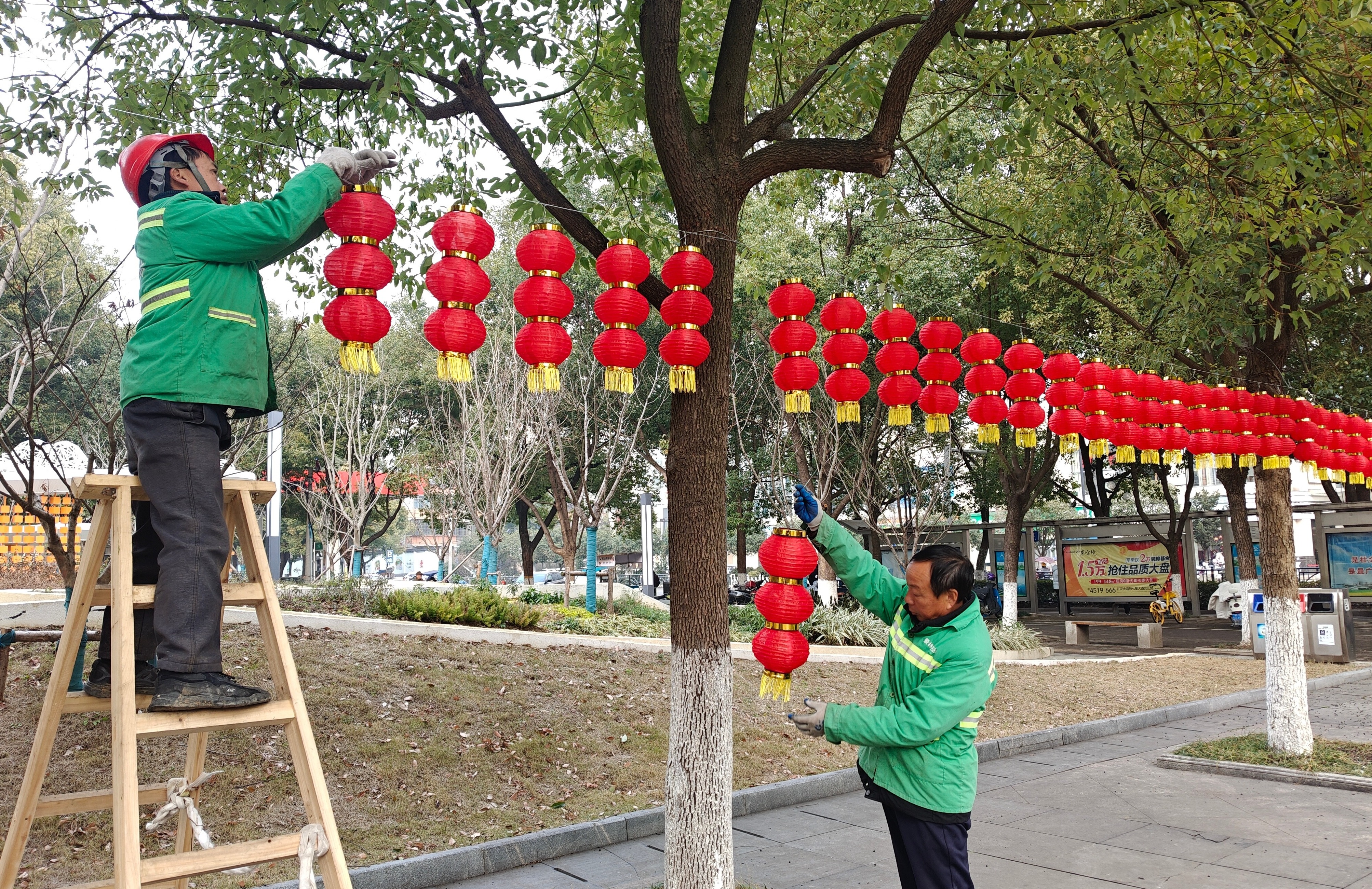 红灯笼,年味浓。在五柳公园、丹阳公园等公园广场,工作人员已悬挂红灯笼2000余个,火红的灯笼错落点缀于树梢,与园内的绿意相映成趣,提前透出浓浓的年味。