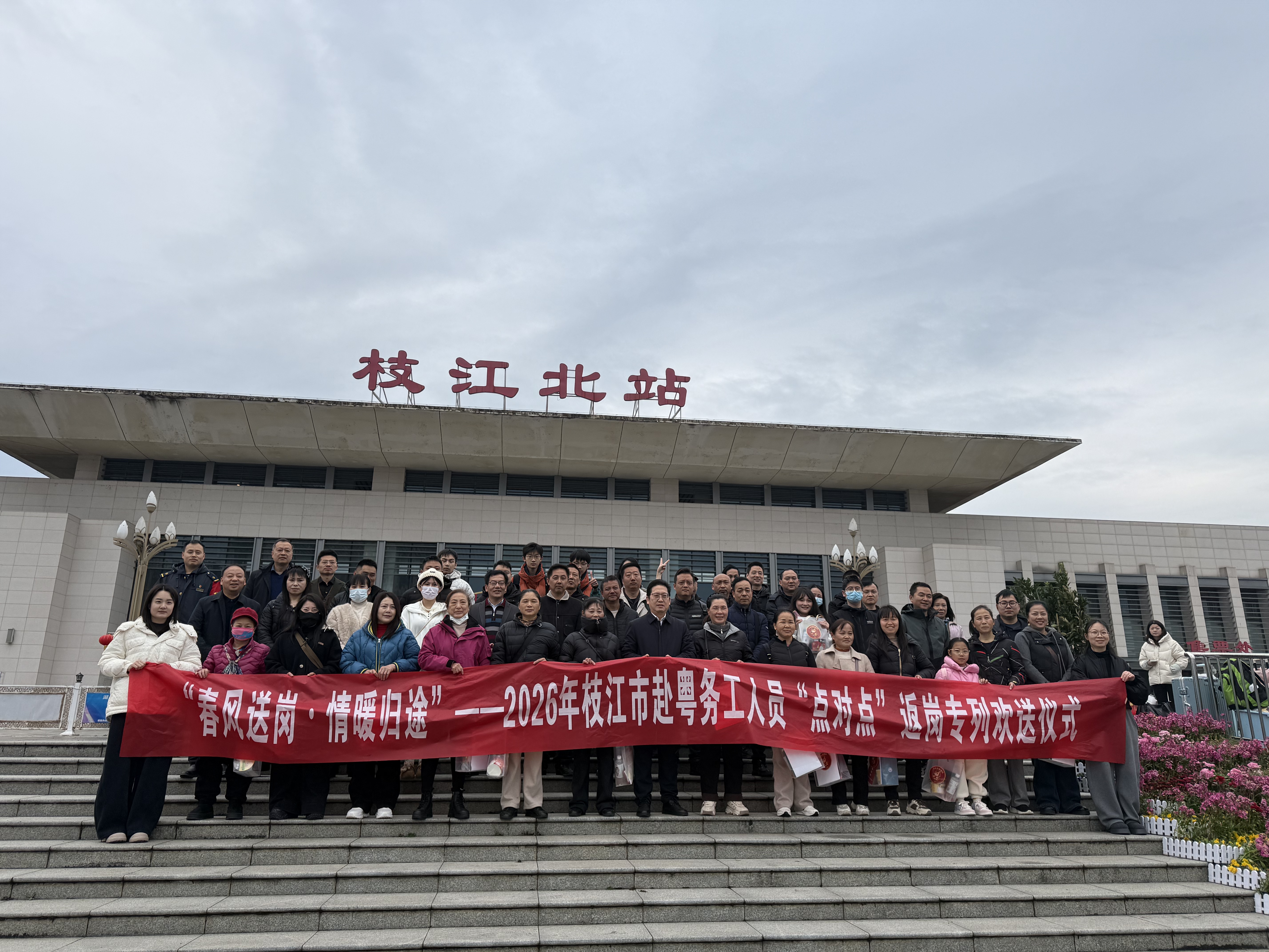 枝江融媒(通讯员 费宇)春风送岗暖民心,骏马奔腾启新程。2月26日,枝江北站站前广场人头攒动、客流密集。上午9时,以“春风送岗·情暖归途”为主题的枝江市2026年赴粤务工人员“点对点”返岗专列欢送仪式在这里温情启幕,免费为45名游子送上票面价值621元的返岗车票和“春风礼包”。
