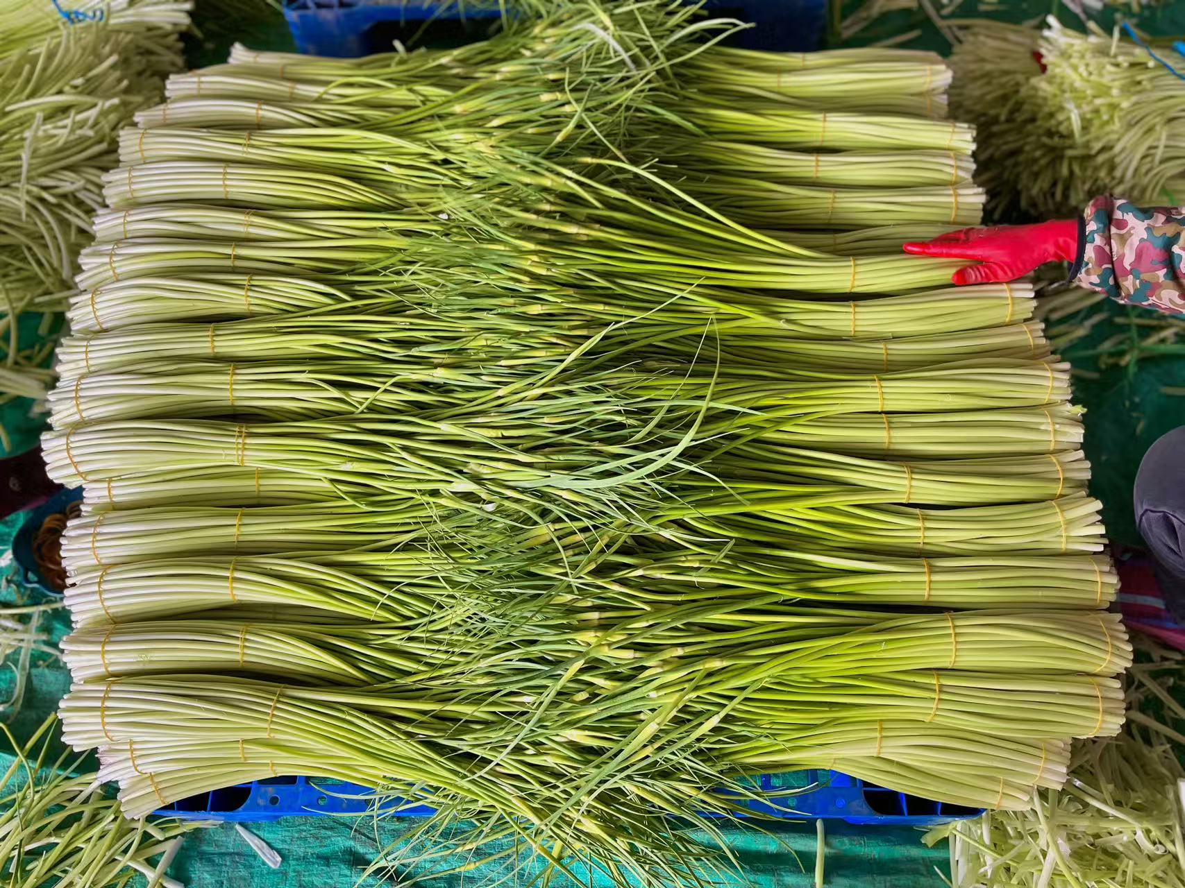 蒜薹是春季备受青睐的时令蔬菜,不仅口感脆嫩、香味浓郁,还具有很高的食用价值。其富含维生素、膳食纤维及多种矿物质,营养丰富,老少皆宜。而马羊洲村独特的土壤、水源和气候条件,造就了蒜薹上乘的品质。