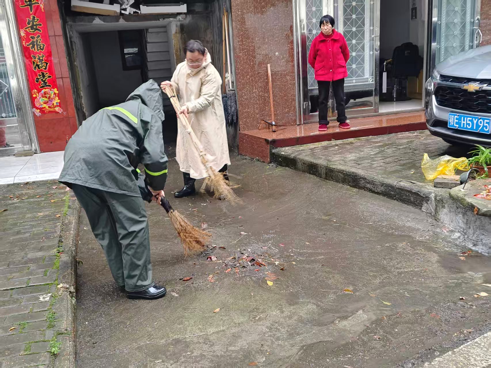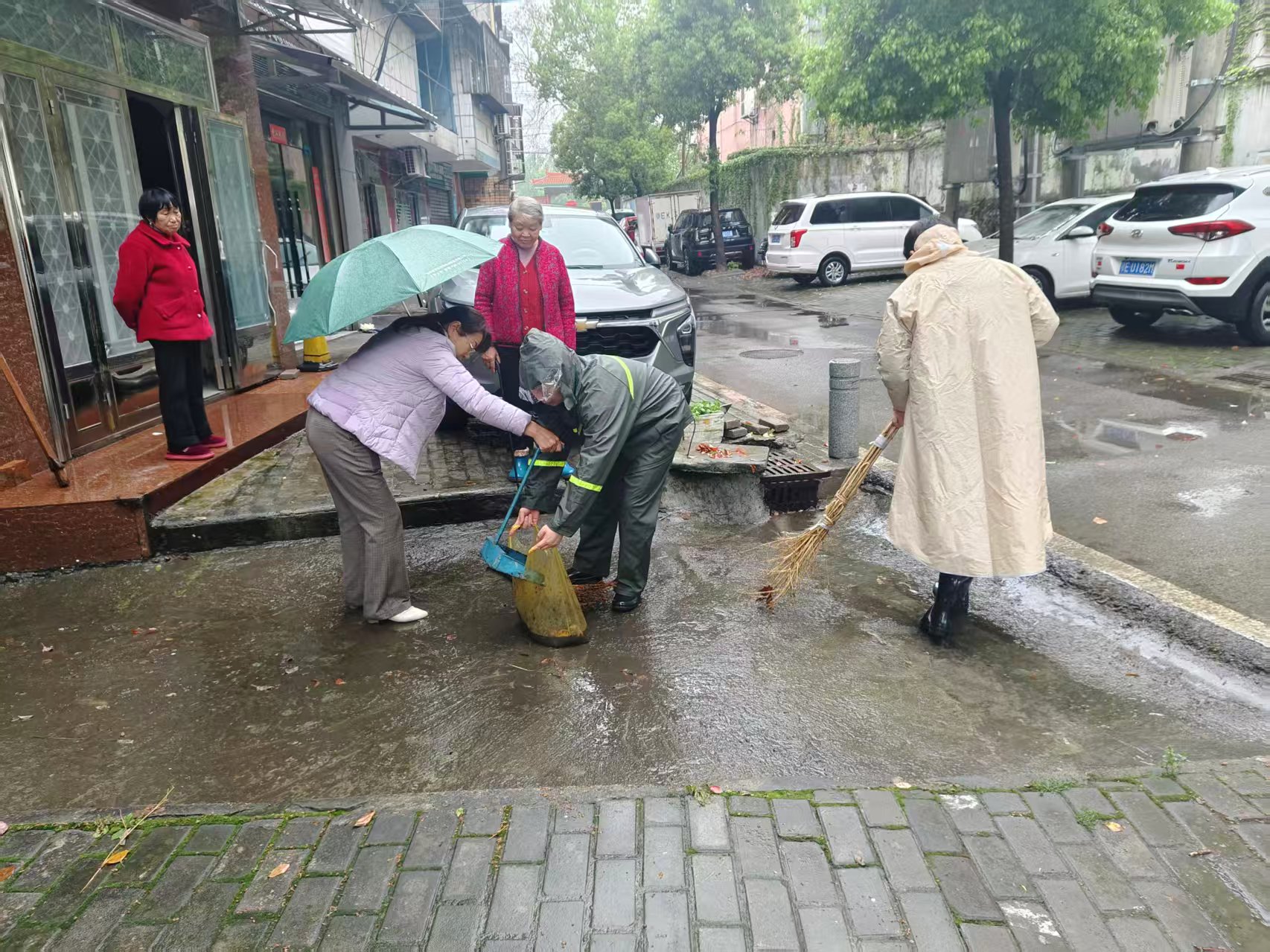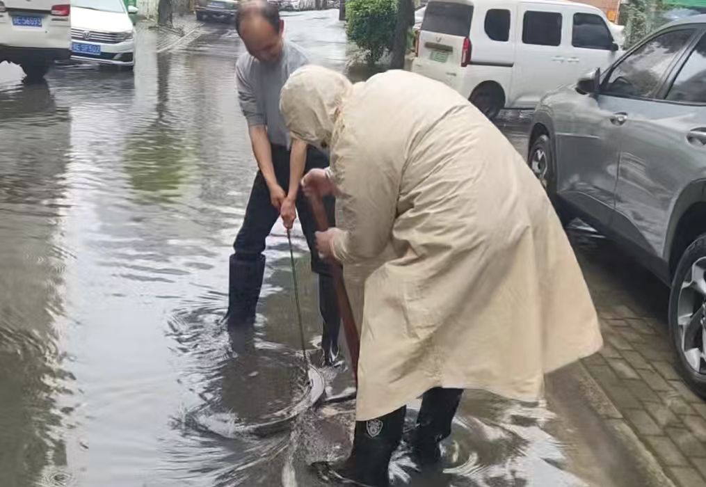两人随即身着雨衣、手持铁钩和扫帚,迅速清理下水道口杂物与淤泥。经过近二十分钟的清理,堵塞点位顺利疏通,排水恢复顺畅。针对其他疏通难度较大的点位,网格员们分工协作:有的撬开堵塞盖板,有的清理深层淤泥。短短半小时内,辖区多处堵塞下水道被成功打通,路面积水隐患迅速排除,道路恢复正常通行,有效避免了积水倒灌居民家中。