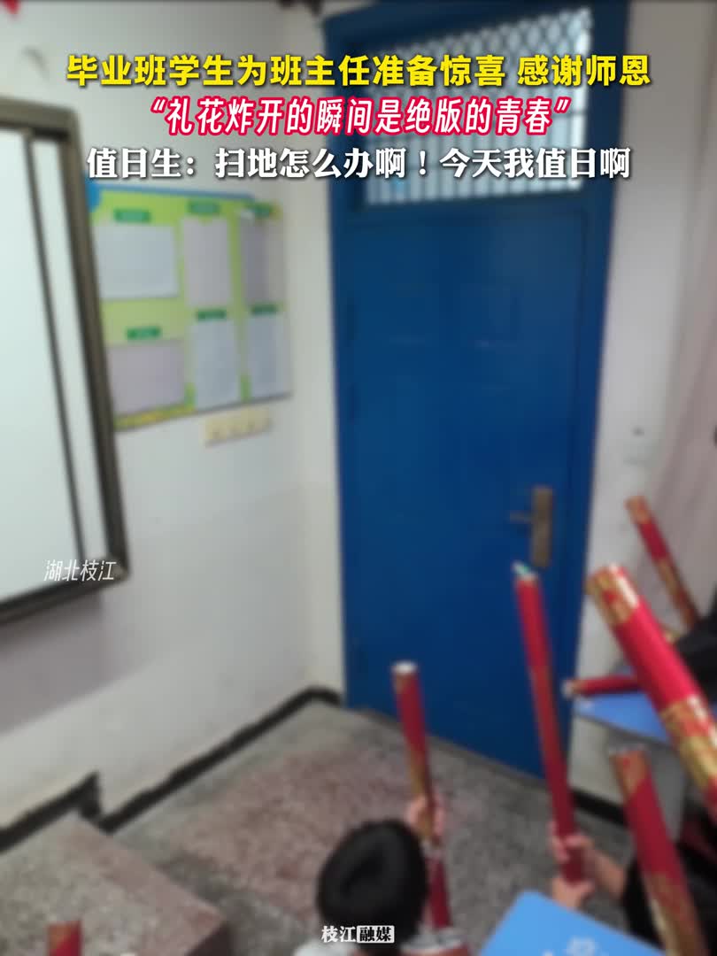 “礼花炸开的瞬间是绝版的青春。”毕业班学生为班主任准备惊喜,感谢师恩。值日生:扫地怎么办啊,今天我值日啊!