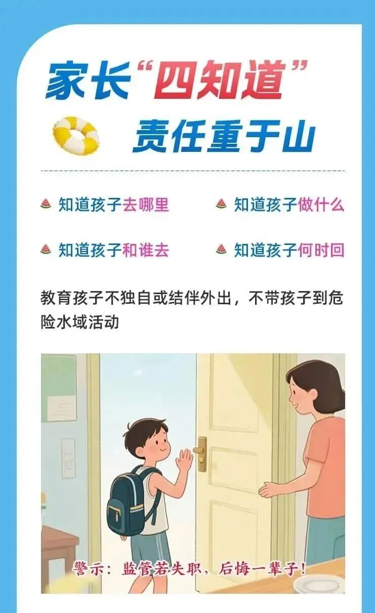 家长是孩子安全的第一责任人,尤其是周末、节假日、放学后等溺水高发时段,务必全程掌握孩子动态,严格做到“四知道”:知去向、知同伴、知活动内容、知归家时间。严禁孩子独自或结伴前往水域周边,从源头杜绝溺水风险。