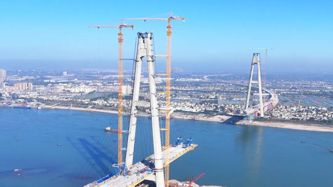 枝江长江大桥已全面进入塔身施工阶段,预计2024年年底完成257.5米塔柱施工